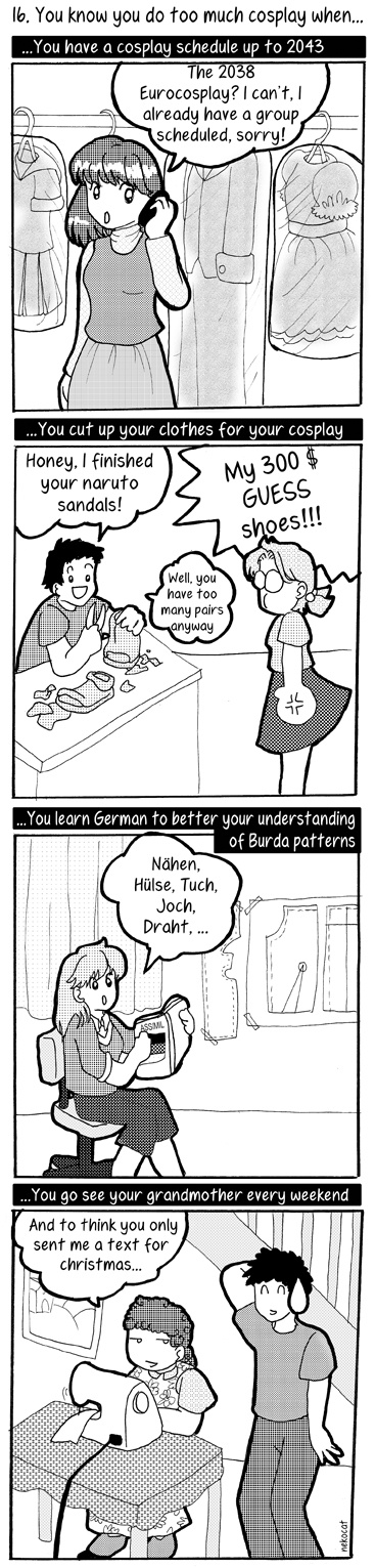 Started in july 2010 with pace of a comic every 2 weeks or so and posted on DeviantArt and cosplay forum, we talk about stories on cosplay and conventions. More or less true, more or less exaggerated, in any case it's very funny!