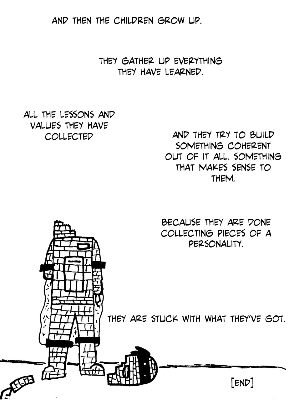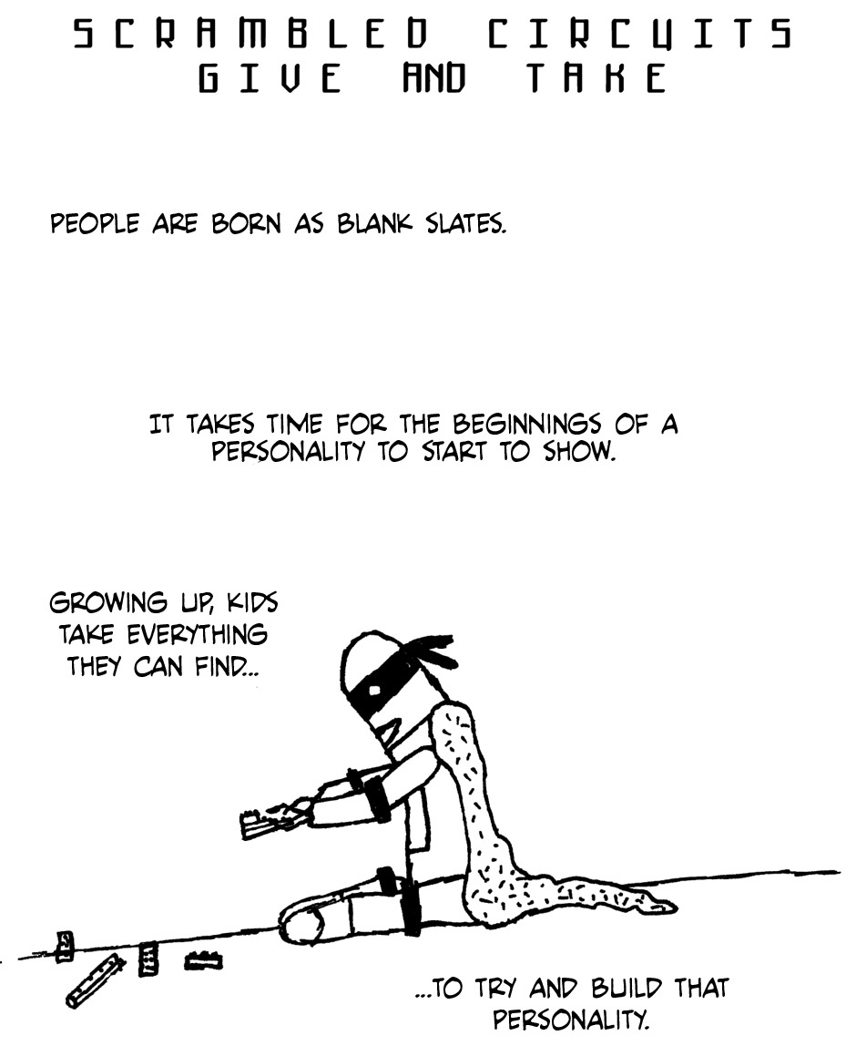 These were mostly made between January of 2009 and November 2011. Each of those years saw a 20-30 page issue of Scrambled Circuits released by Cameron Callahan consisting of short stories starring the robot Primus and his attempts to connect with the people around him (and sometimes his attempts to avoid them). This is every story in the first three issues in chronological order from the perspective of Primus.