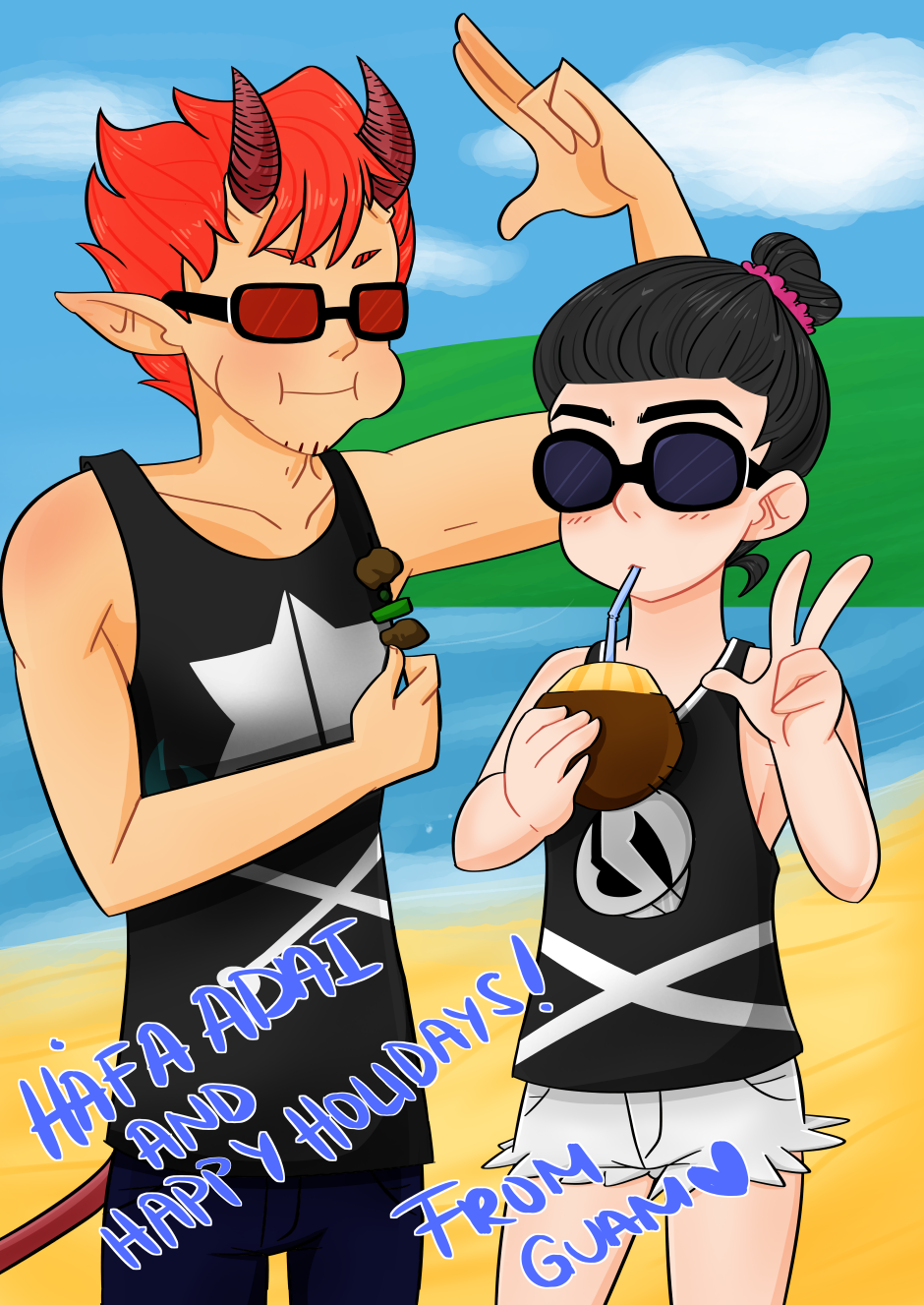 Happy Holidays from Guam!!! I decided to draw them in a more tropical scenery because, well practically everyone is doing a white Christmas. And fun fact Yonaka and Claudius do not like the cold at all XD