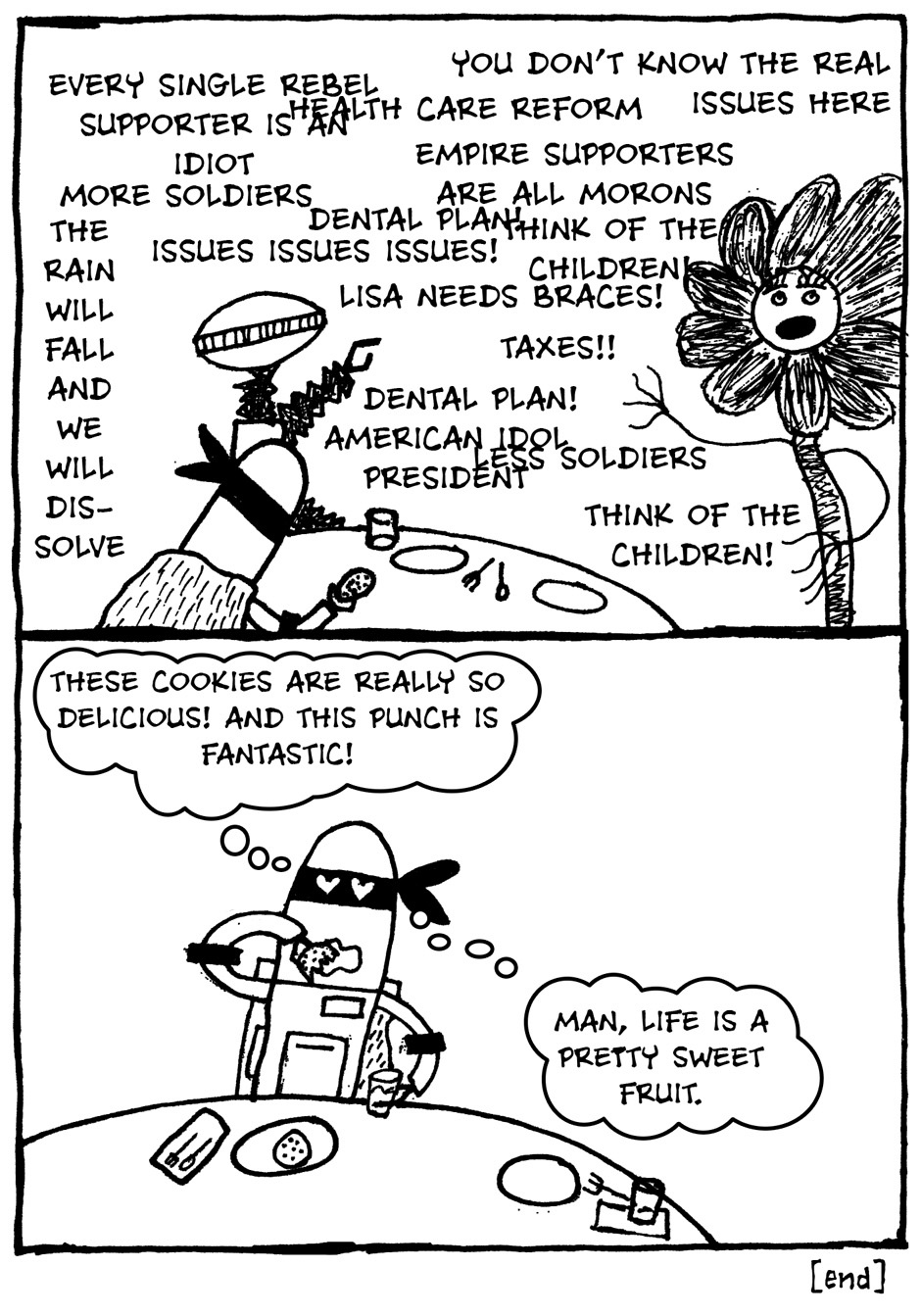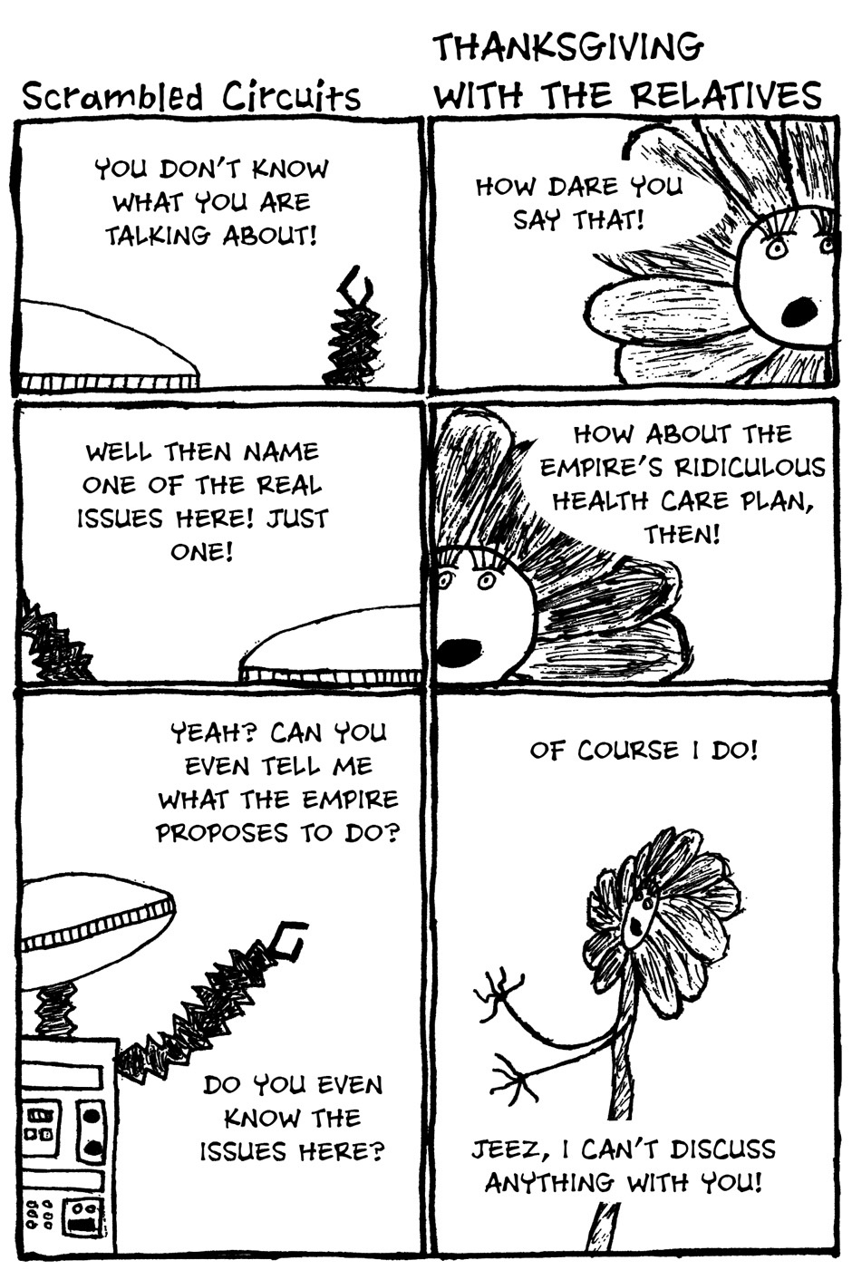 These were mostly made between January of 2009 and November 2011. Each of those years saw a 20-30 page issue of Scrambled Circuits released by Cameron Callahan consisting of short stories starring the robot Primus and his attempts to connect with the people around him (and sometimes his attempts to avoid them). This is every story in the first three issues in chronological order from the perspective of Primus.