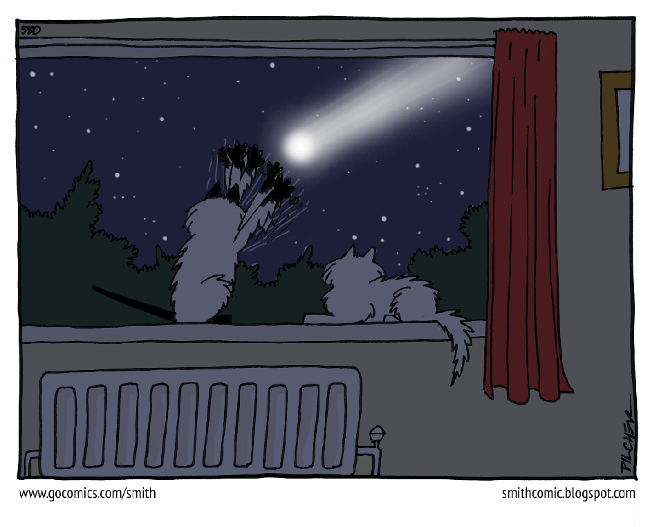 Nevertheless, lets pretend all that never happened. This strip was inspired by Smudge and Cholmondeley’s (two real cats who were the originals for the blue cats that appear in this strip) reaction to fireworks whenever they saw them through the front room windows. They loved them and tried to paw at them before they fizzled out. This was based on me imagining what their reaction would be to a comet which just hung there in the sky, the way that comets do. Well, the ones that can be bothered to put on a proper show anyway.