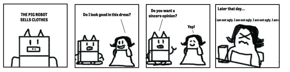 Pig Robot sells clothes to women