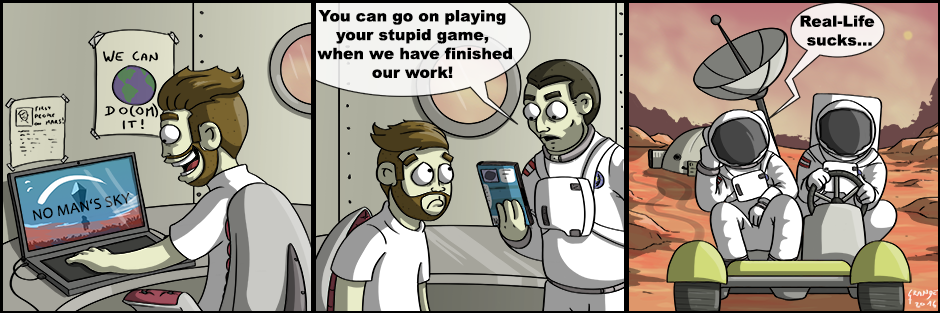 I think every gamer knows this situation: You love doing things in games, which you hate in Real Life. I for example loved to farm and plant stuff in Minecraft, but every flower I touch in Real-Life instantly commits suicide ^^. I tried to show this in a more extreme way and had to think of No Man’s Sky and the Mars one expedition.