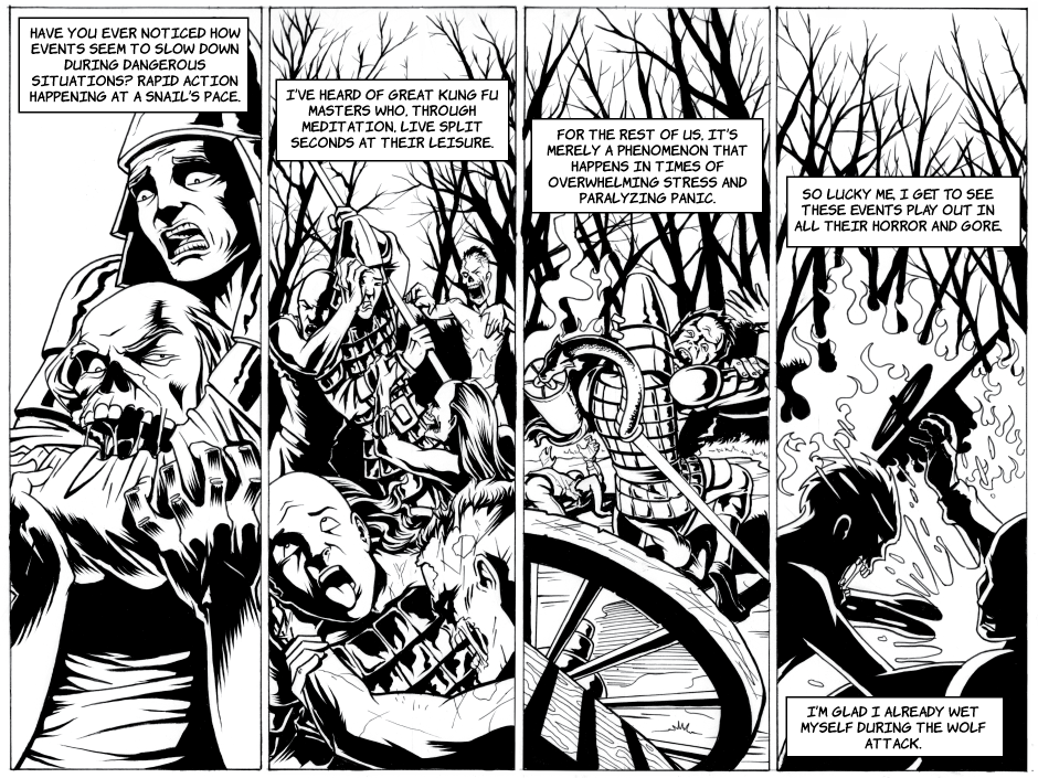 Hey everyone, thanks for tuning back into the Comic for the beginning of "Undead Madness". As you probably figured out, yes, they were all Undead Zombies. These scenes always remind me of Zombieland where they come up with rules to survive. This one definitely falls under the 'Double tap' rule. However it does seem to establish the idea that Zombie, or 'Jiangshi' presence in this area or world is not common. Even in the forest of 'Shiquile Danning'. I want to give a Shout out to Justin Peniston of Hunter Black for help with dialogue & Grammar on a lot of these pages. Unless it's wrong then I probably 'Changed something'. =)