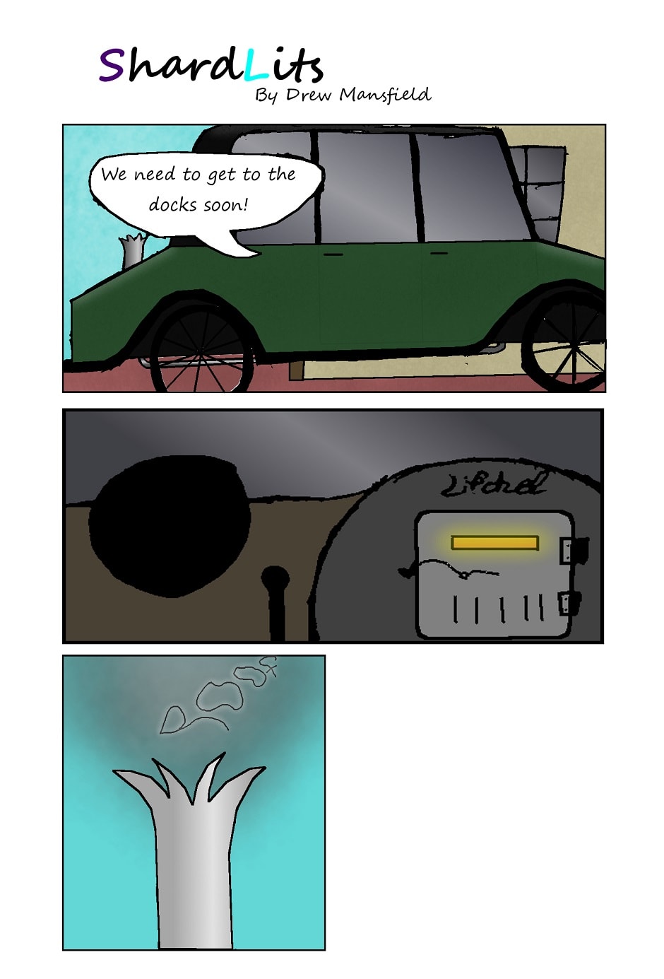 Founders begin to depart in a fancy steam cart produced by Lifchel Steam Corp.