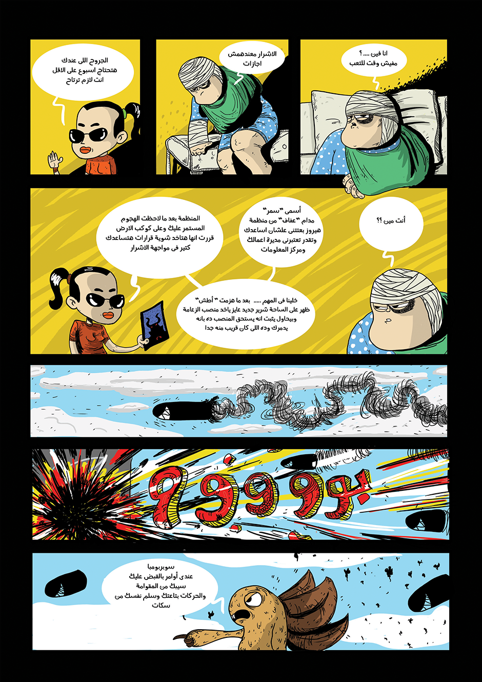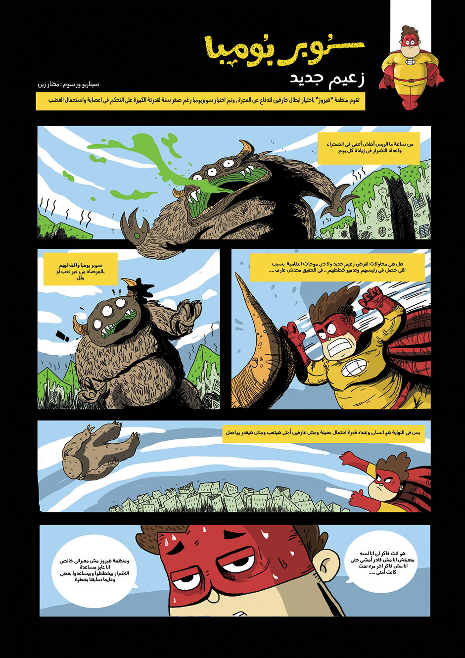 bomba is super hero his powers come from his ability to anger management and stay calm under pressure he can absorb negative energy and then use it as power , in other hand he is a lazy gamer kid how loves to eat traditional Egyptian food or to be honest he loves all kind of food , he work for universal organization for hero's called the organization