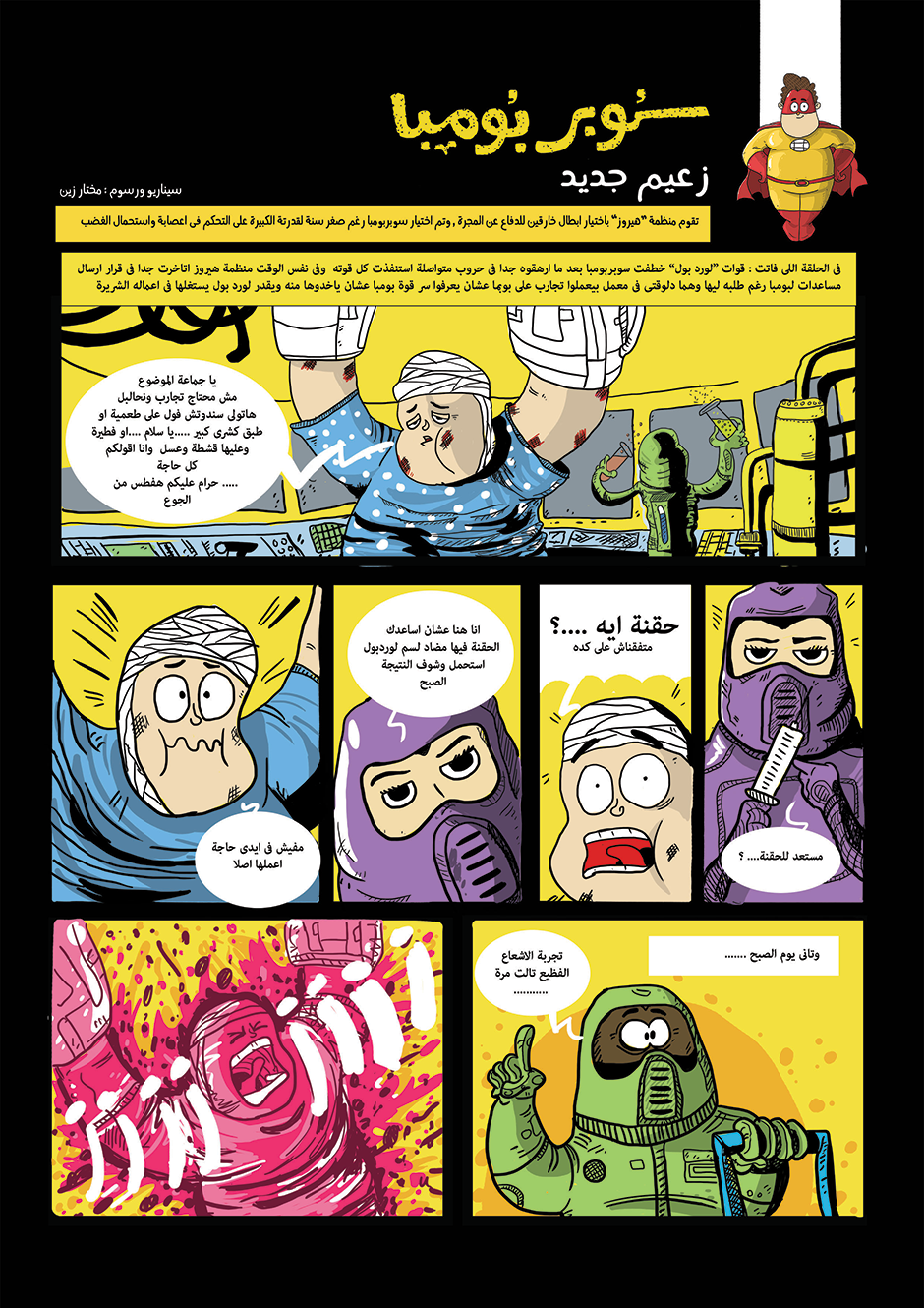 bomba is super hero his powers come from his ability to anger management and stay calm under pressure he can absorb negative energy and then use it as power , in other hand he is a lazy gamer kid how loves to eat traditional Egyptian food or to be honest he loves all kind of food , he work for universal organization for hero's called the organization