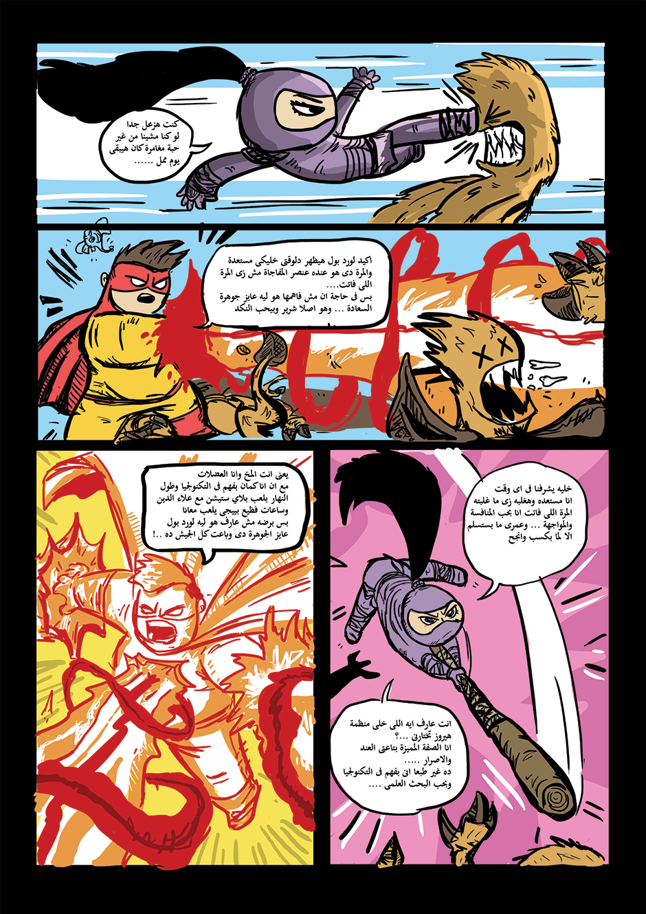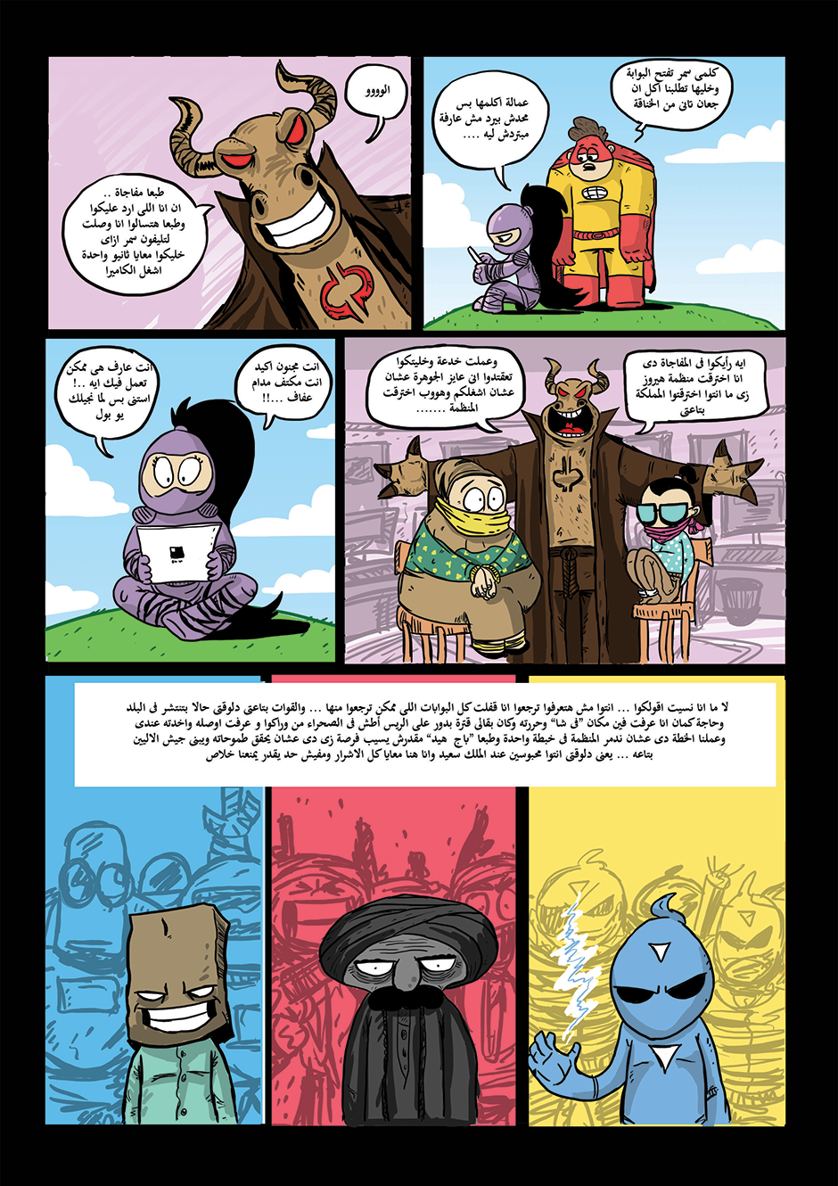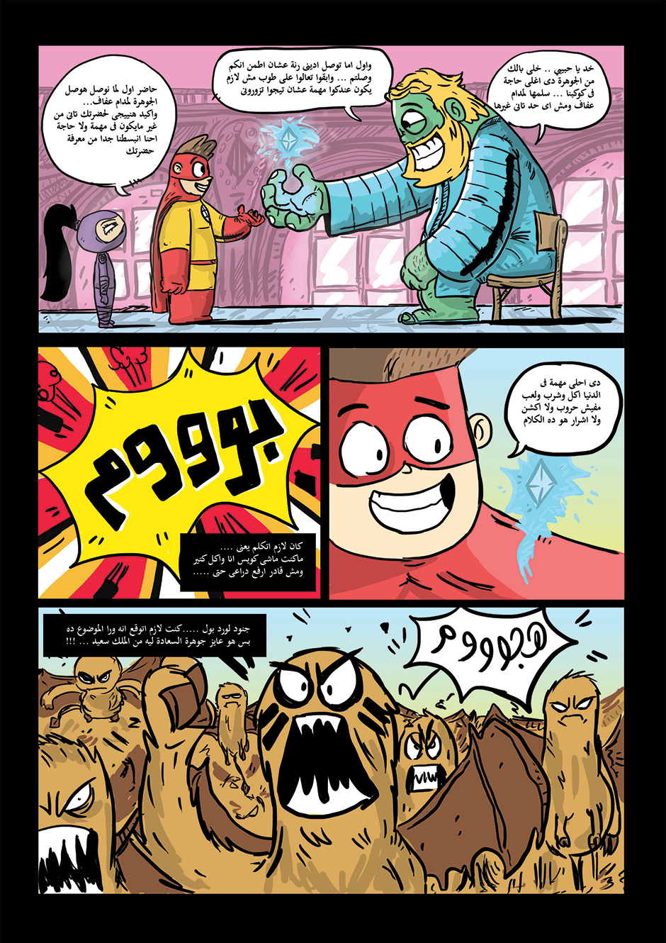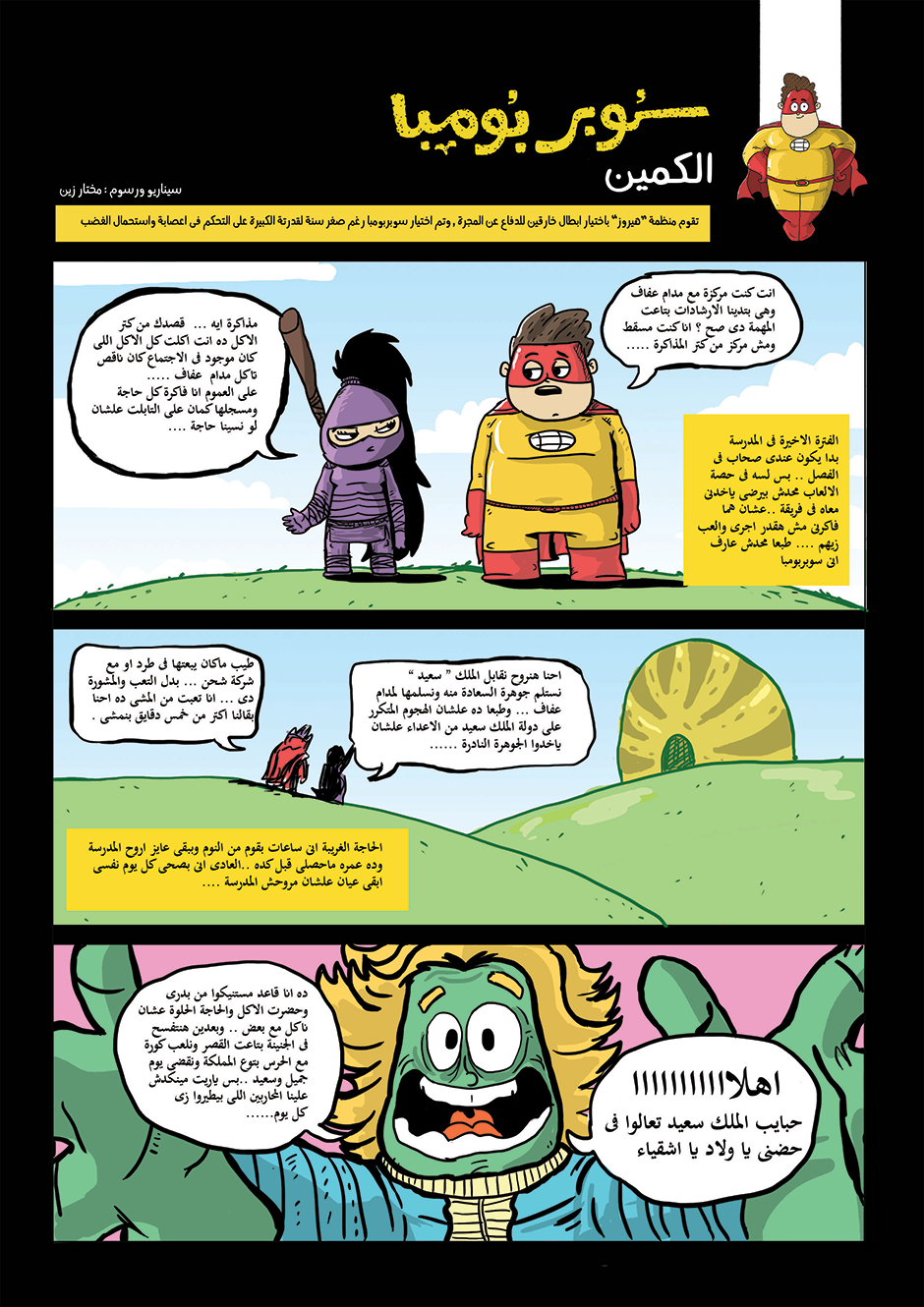 bomba is super hero his powers come from his ability to anger management and stay calm under pressure he can absorb negative energy and then use it as power , in other hand he is a lazy gamer kid how loves to eat traditional Egyptian food or to be honest he loves all kind of food , he work for universal organization for hero's called the organization