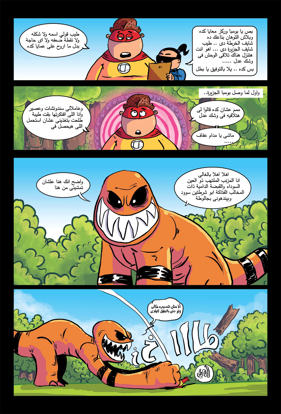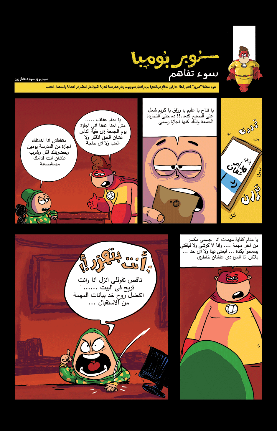 bomba is super hero his powers come from his ability to anger management and stay calm under pressure he can absorb negative energy and then use it as power , in other hand he is a lazy gamer kid how loves to eat traditional Egyptian food or to be honest he loves all kind of food , he work for universal organization for hero's called the organization
