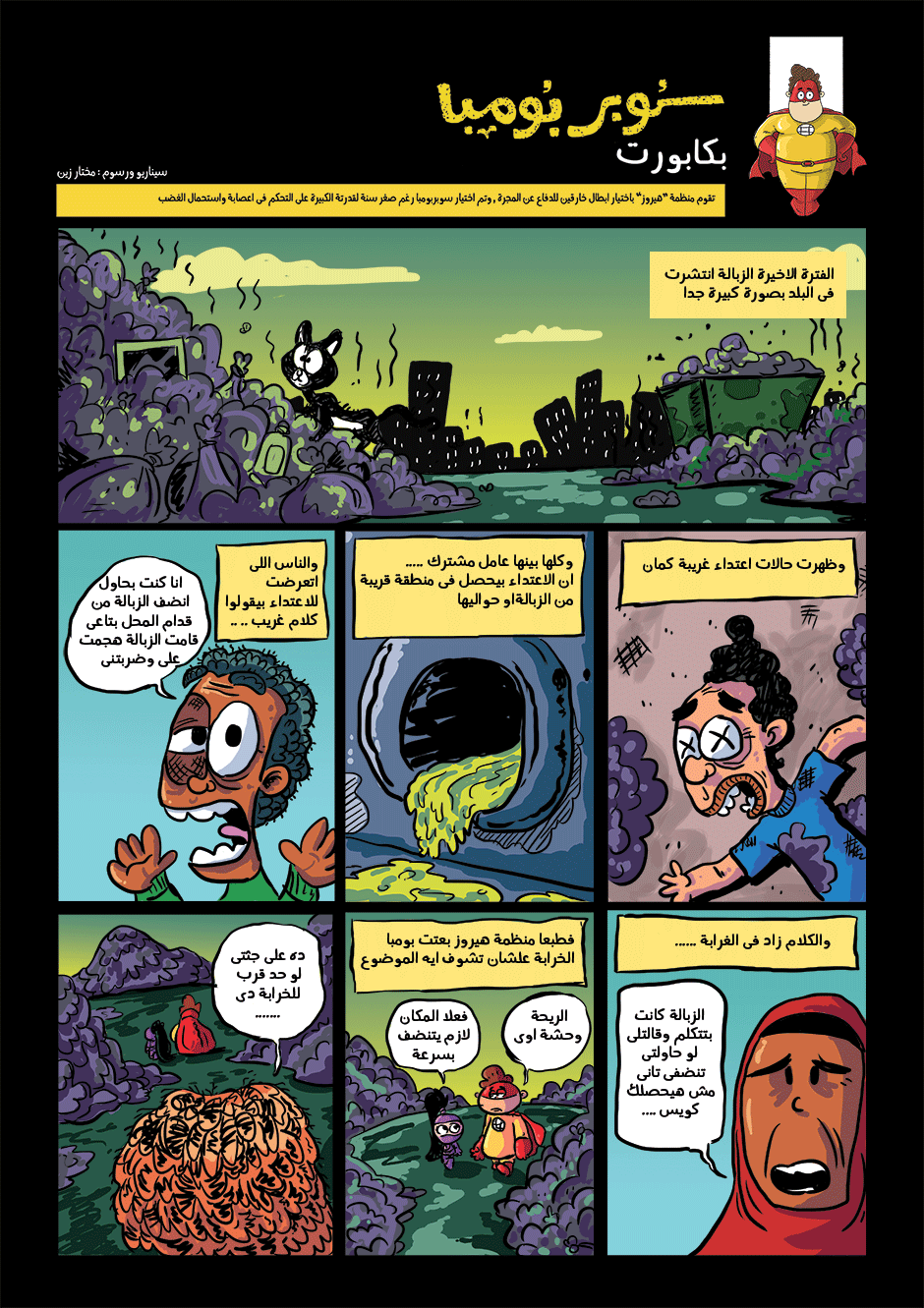 bomba is super hero his powers come from his ability to anger management and stay calm under pressure he can absorb negative energy and then use it as power , in other hand he is a lazy gamer kid how loves to eat traditional Egyptian food or to be honest he loves all kind of food , he work for universal organization for hero's called the organization