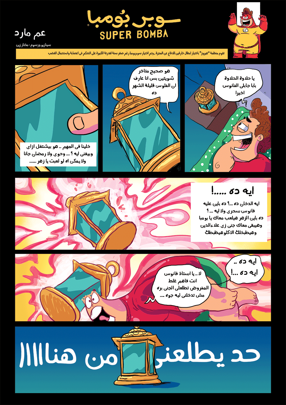 bomba is super hero his powers come from his ability to anger management and stay calm under pressure he can absorb negative energy and then use it as power , in other hand he is a lazy gamer kid how loves to eat traditional Egyptian food or to be honest he loves all kind of food , he work for universal organization for hero's called the organization