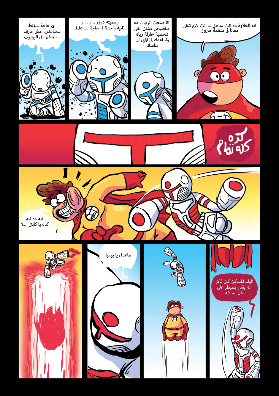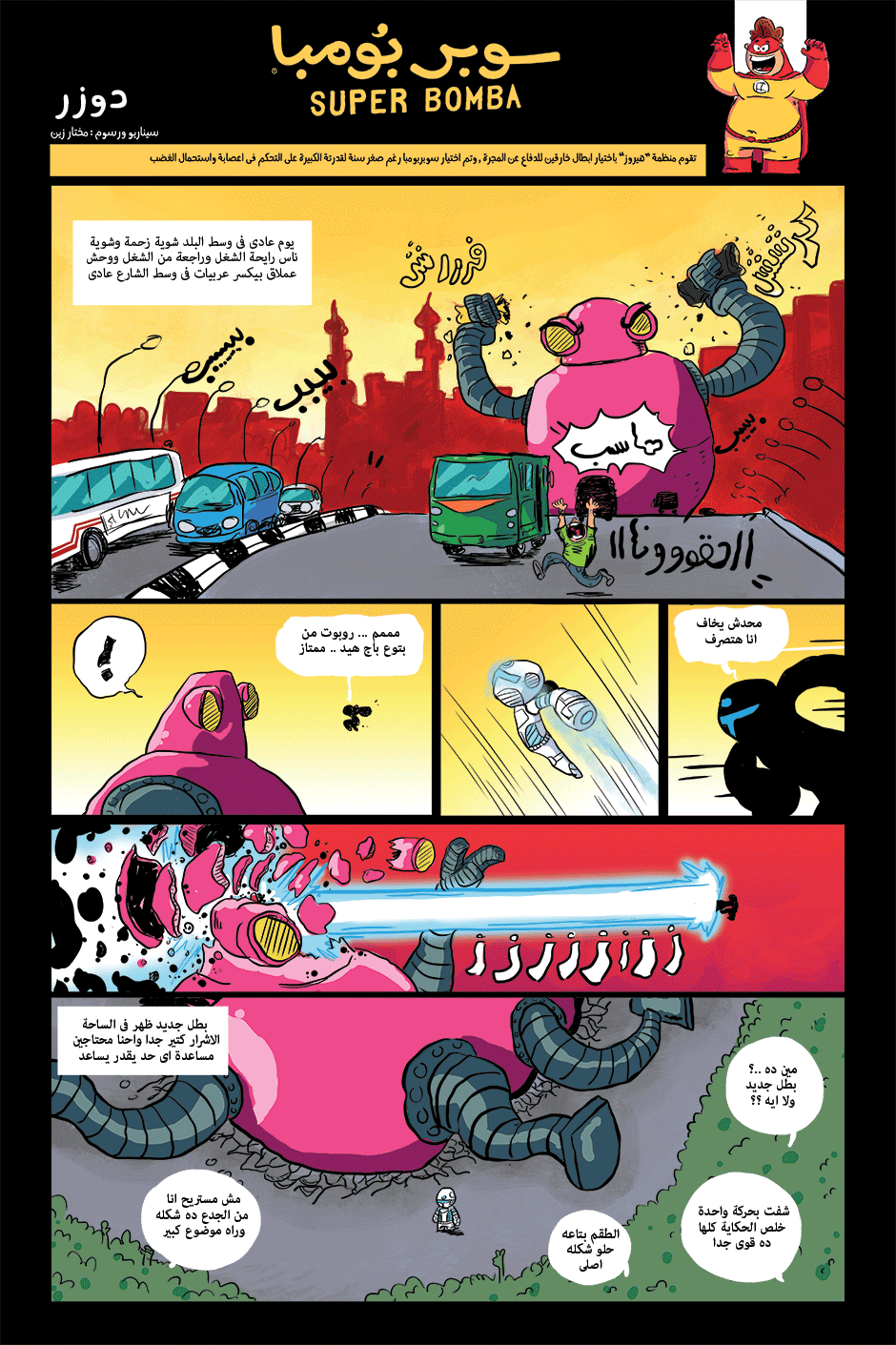 bomba is super hero his powers come from his ability to anger management and stay calm under pressure he can absorb negative energy and then use it as power , in other hand he is a lazy gamer kid how loves to eat traditional Egyptian food or to be honest he loves all kind of food , he work for universal organization for hero's called the organization