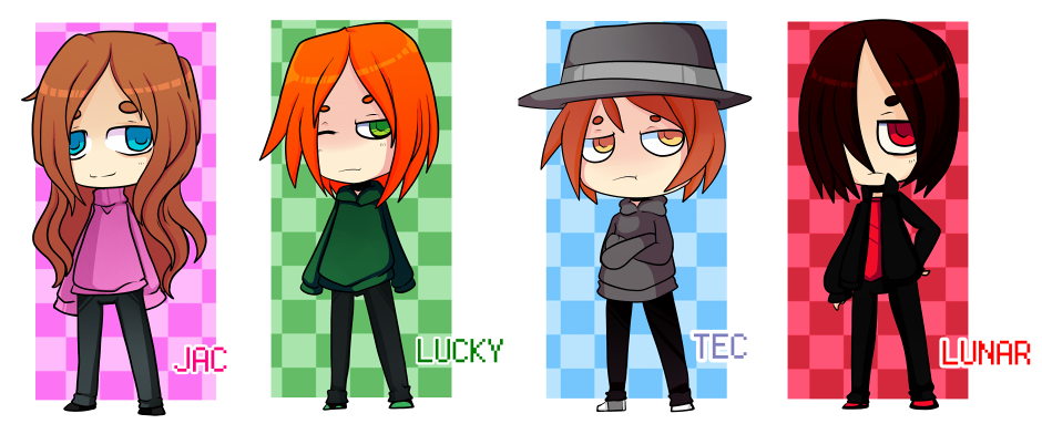 First up on the Roster we have Twitch's Human souls: Jac, Lucky, Tec and Lunar. Each power souls hand picked by the misfortune demon. Jac: A Positive bubbly soul who enjoys writing, video games and random Ships. Lucky: An Eccentric soul who enjoys Swing dance and props making Tec: A Quiet soul who enjoys Animation and burning stuff Lunar: A Sarcastic soul who enjoys being a moon