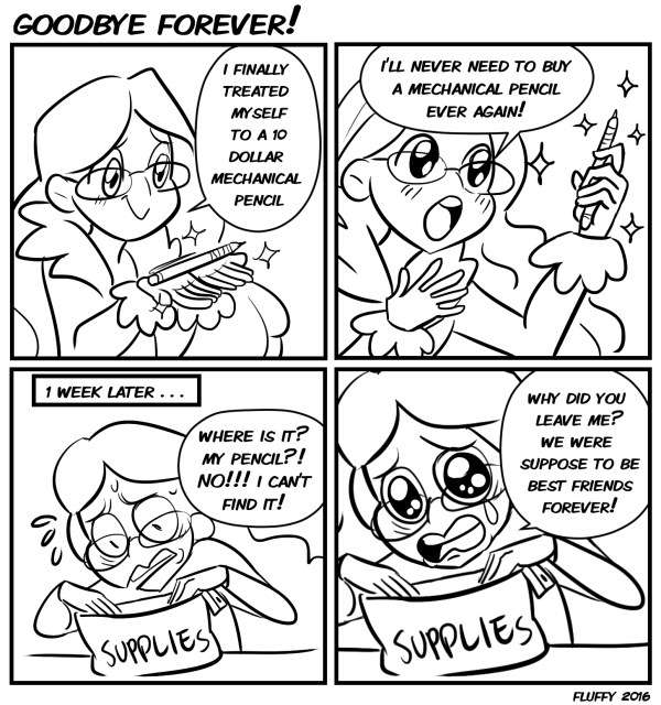 This is too true.. its like having fine pens in the beginning of a school year and at the last day of school the only pen you have left is something found and a pen without a cover.. shit happens