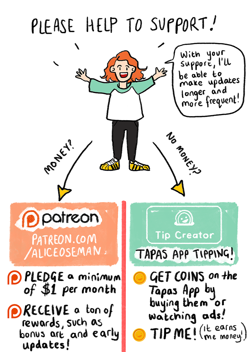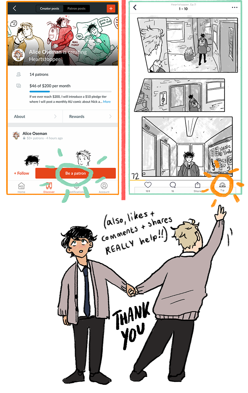 Another way to support me, if you're able, is Patreon - supporting me there gets you all sorts of bonus Heartstopper extras, including early updates (if you're finding last update's cliffhanger too much to bear!).