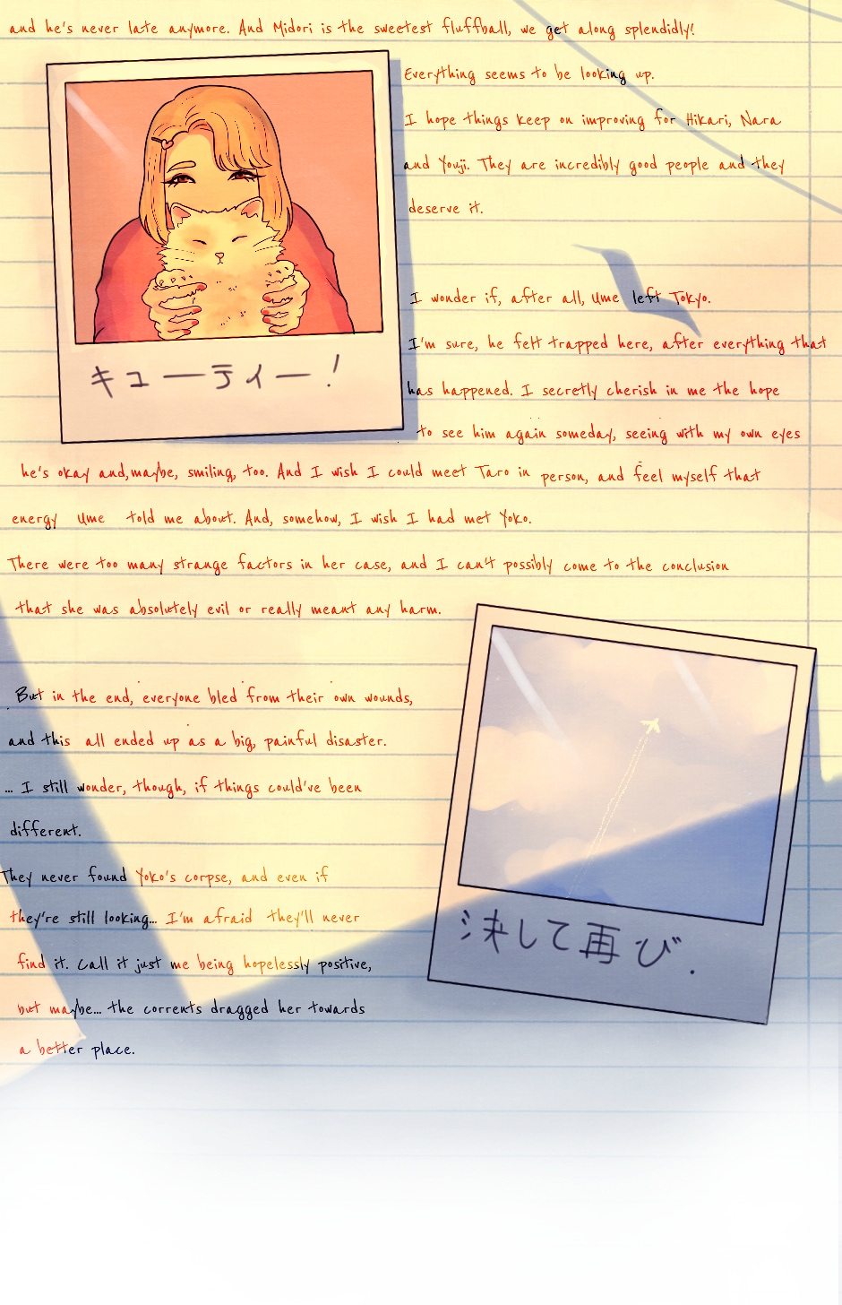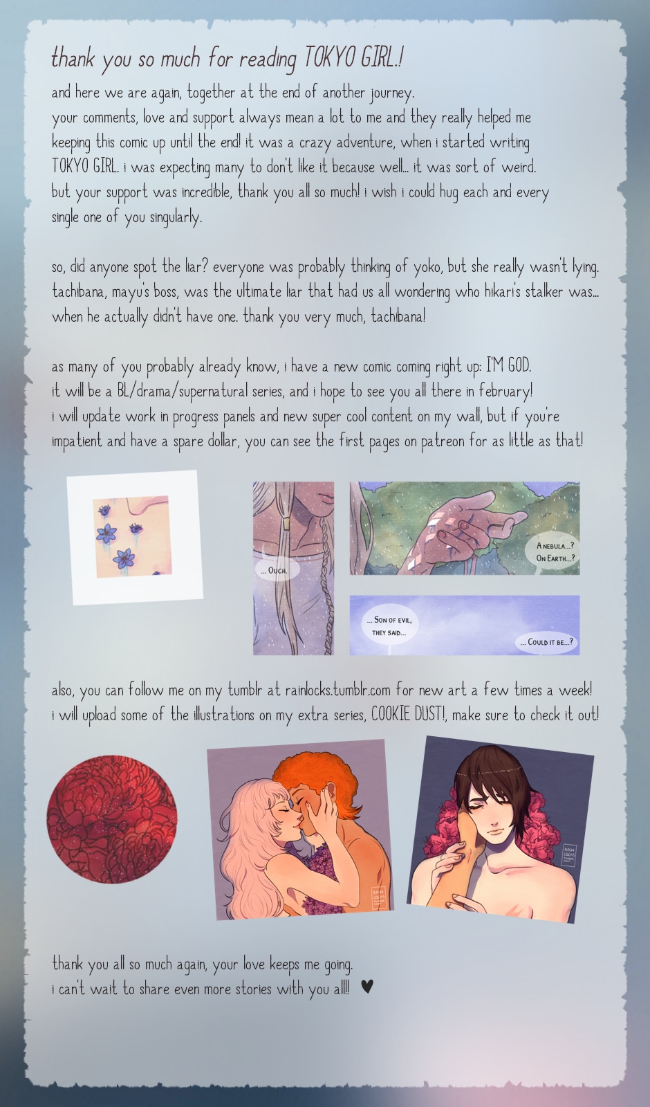 .. it's over guys, it's really over!! i am so excited, so happy, so sad, i don't even know anymore!! it feels so bittersweet, but also great, having my second original series finally complete. thank you all so much for your love and support guys!! i love you all so much!! ♡ i hope you enjoyed this story!! it was important to me writing something about focusing so much on oneself, you barely see others you can't see suffer just as much as you. once again, i hope you liked this and i can't wait to see you in my next comic!! ♡