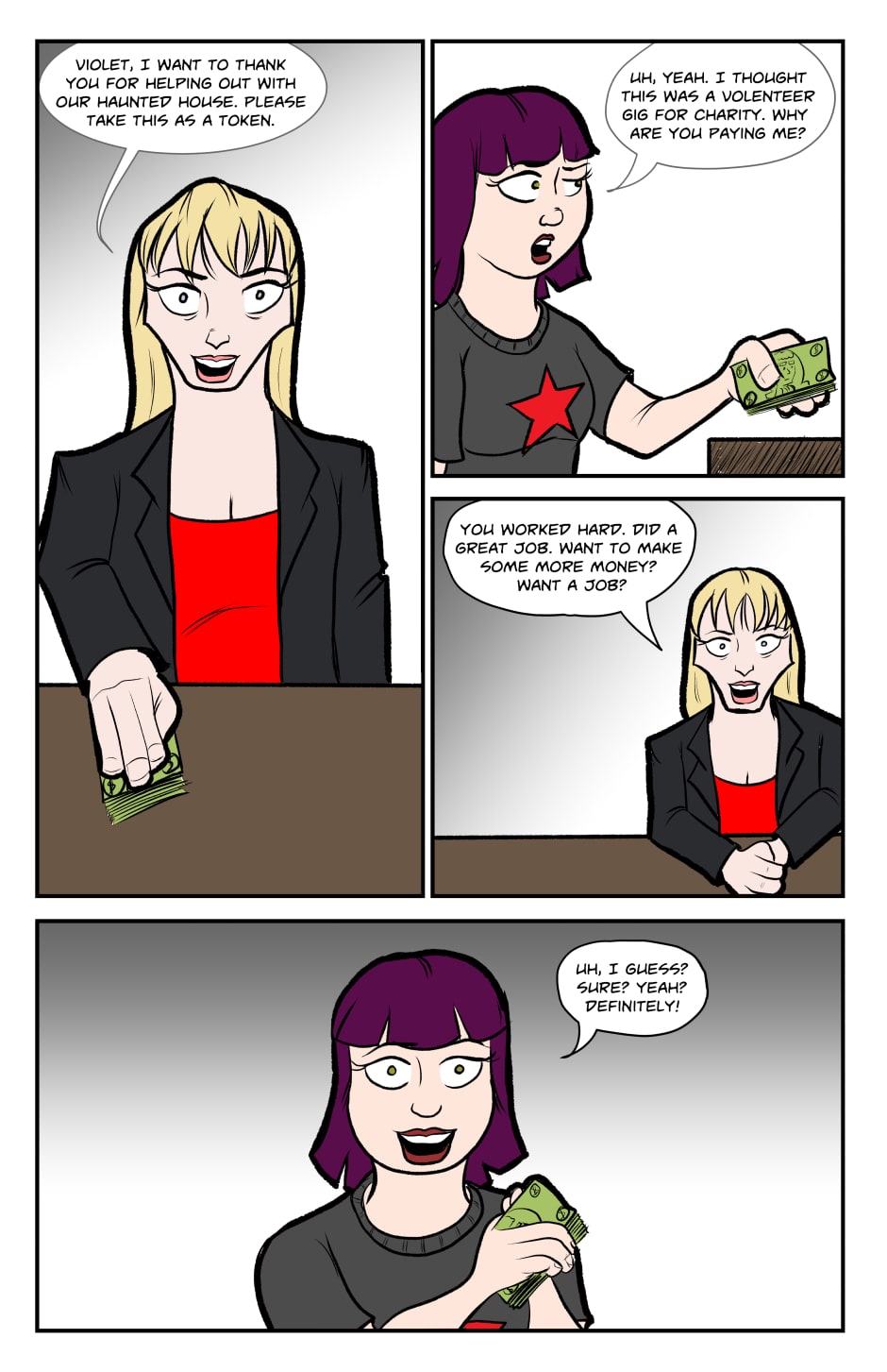This is how Violet got a job at the costume shop. I'm going to be playing a bit with the formatting over the next few comics. Let me know what you like and don't like. I felt it looked a little unfinished this week.