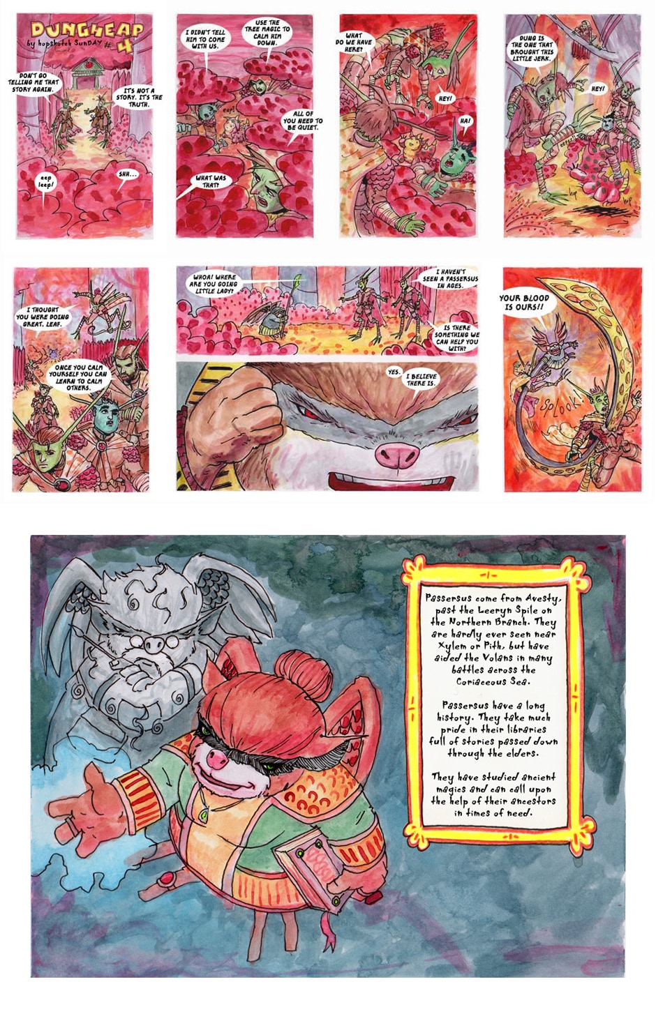 Follow the adventures of Dungheap, a kid from two opposing races, the Volans and the Erts, living on top of a magical tree, being chased by powerful creatures that haven't been seen in over a hundred years. You can learn more at my Patreon. Link is above.