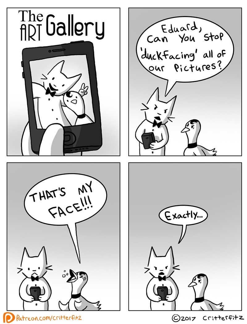 #cat #duck #the_art_gallery #bow_tie #iphone #cell_phone #selfie #webcomic #Comic #cute #animals #anthro #furry #Duck_face #duckface #duck_facing #duckfacing