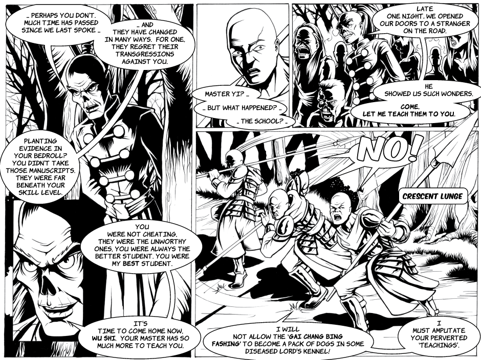 Sometimes it's late and you are just posting your page just in time. =) But yes, a talking undead figure from out of Wu Shi's Past? How Mysterious... =) I had a great time with this page, particularly the triptych of our Kung Fu Captain's 'Crescent Lunge'