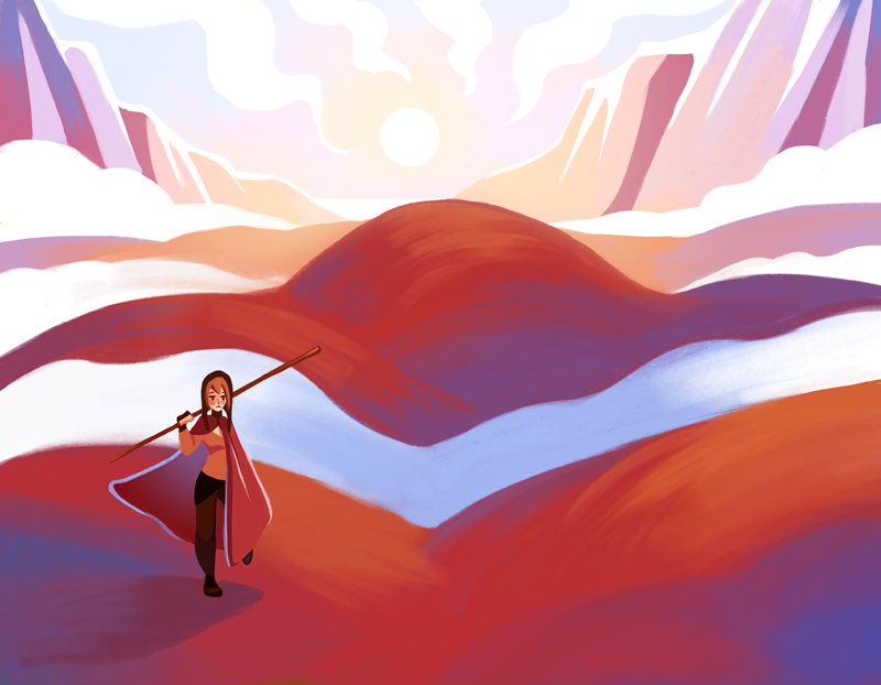 Day 3: Andi started to trek back into the sleepy town. She carried her trusty stick over her shoulder and she stepped over the fields that would one day be golden wheat. The fog started to disperse as the sun grew hotter in the clear skies above. Her quiet time was over.