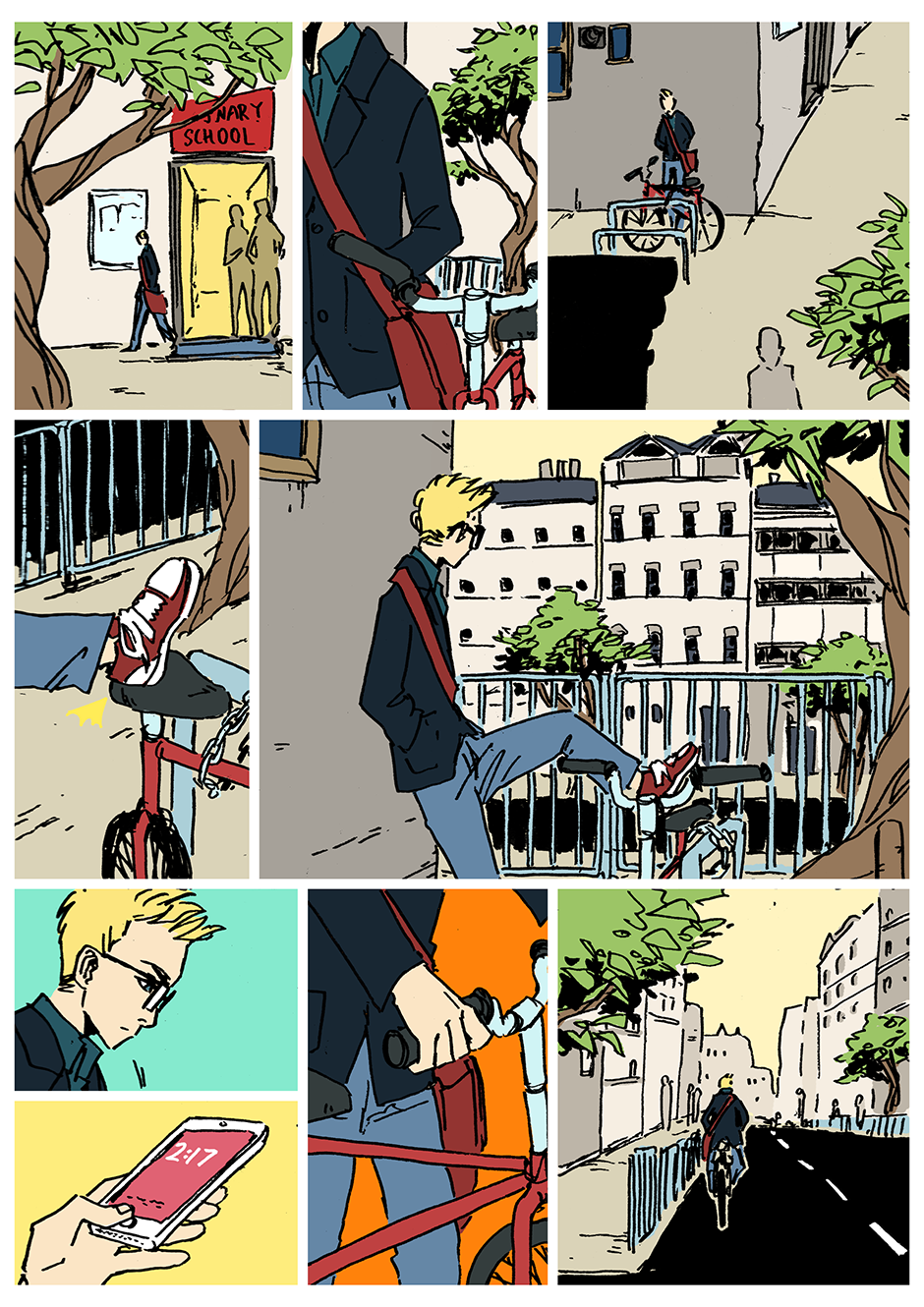 the gesture of putting his foot on the bike is perfectly done. it's amazing how well you're conveyinh this story without words!