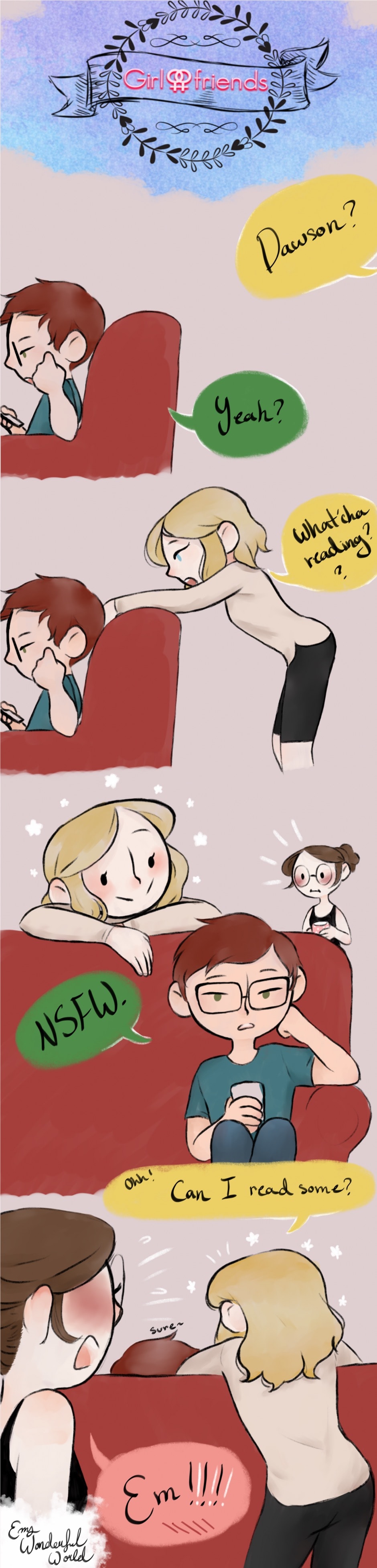 He's reading porn, basically. While hanging out with lesbians. Three guesses as to what type of porn he's reading about. Also that ~ is really off putting, I don't trust dis guy. WHO OPENLY READS PORN WHILE HANGING OUT AT A FRIENDS PLACE
