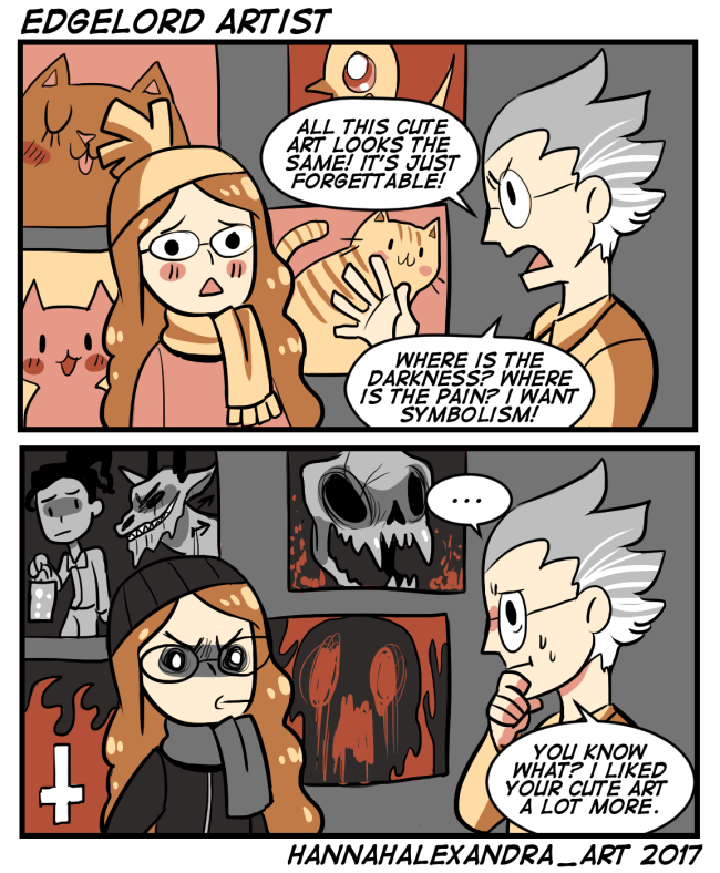 There was this artistic period in my college year that I call my 'Dark Period' of art. I really loved doing art of animals, cute things, and things that made me happy. I got a criticized and I agreed with them so I took the critique and started drawing out of my comfort zone. I ended up drawing some very dark and disturbing death related art and people then started to miss my cute art. My dark period stopped when I discussed this to my teacher. He said that there is no point in creating artwork that you despise, because if your heart isn't into it, your art won't look as good. How can the audience enjoy your work when you aren't true to yourself? Why create art that no one wants to buy or no one wants to see? I don't care much about creating edgy symbolic art that makes people uncomfortable and I agreed. Its okay to draw things that make you happy and build on your strengths. It doesn't make you a 'bad' or 'weak' artist if you don't like drawing a certain genre. You can be successful drawing any type or genre of art if you are passionate for it. Now I kinda dabble in both cute art and monster art. I'm all for critiques and I want to improve and build on my strengths, which is what I'm doing with my daily digital paintings. At the same time though I will remain true to myself by drawing things that make me happy, because it's a part of why I love art!