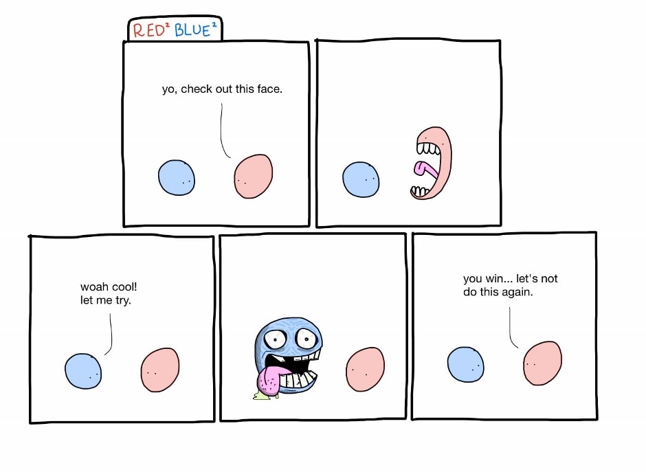 Red and Blue take on a cartoon world. Follow these two circles in their non-sequential adventures and become part of their simply drawn yet complex world while they basically do whatever the hell comes to mind.