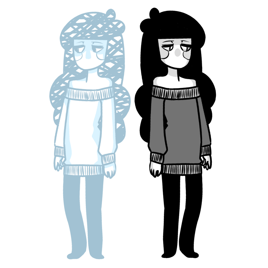 Nimbostratus was the first character I designed! They are my favourite to draw. this is how I draw them in my comic on the left, and how they tend to look in my sketchbook on the right. I thought recreating it digitally would look nice.