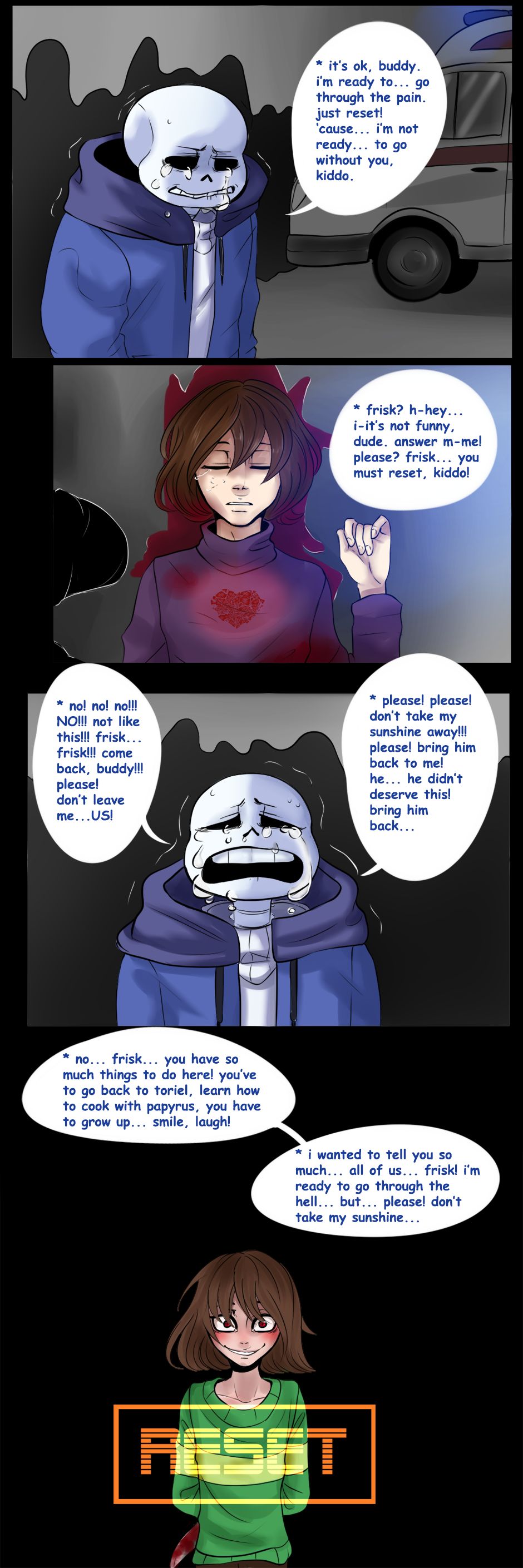 Events take place after the ending "True Pacifist"... and one reset. And perhaps another reset... and one other, probably. Life on the surface is difficult, but people and monsters try to get used to each other. Our heroes are quite happy in their routine, in spite of the nightmares that haunt them.