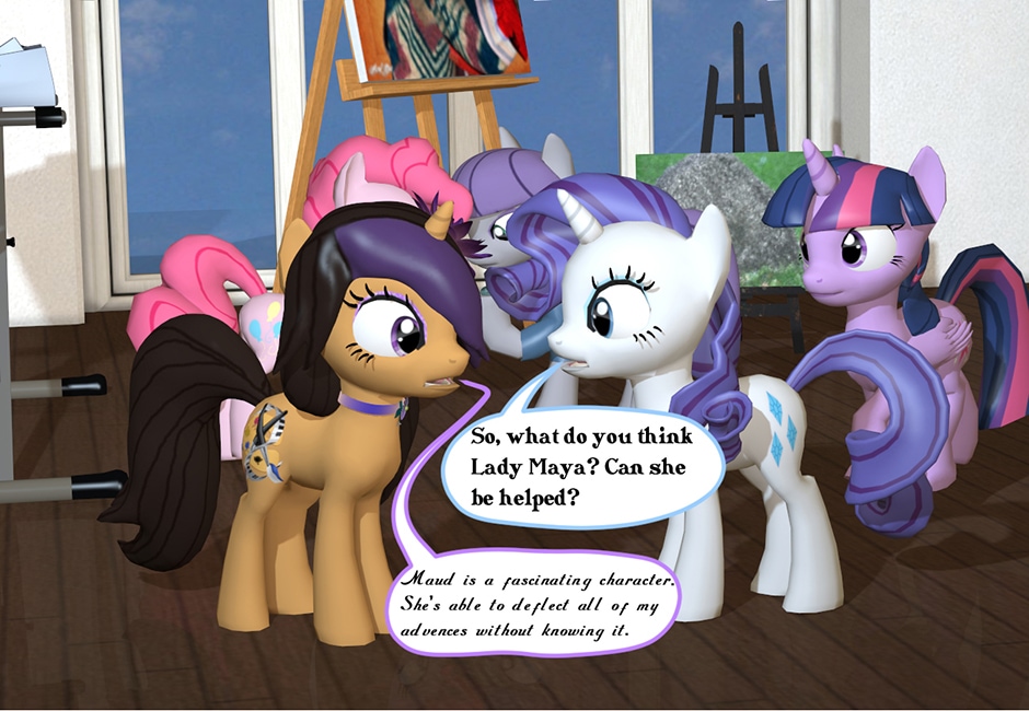 Twilight, Rarity and Pinkie Pie came to see Lady Maya Doi, to help become friends with Pinkie's Older Sister Maud Pie. They are hoping with Maya's expertise as "The Deity of Passion" she can break Maud's "hard as rock shell" so they can become better friends with her. Can Lady Maya get through to the introvert Maud so the girls can become close to their new friend? (Well, it's going to be up for the Pony Maya to do that. The Equestrian Counterpart is just as indifferent towards the meeting as Maud is.)