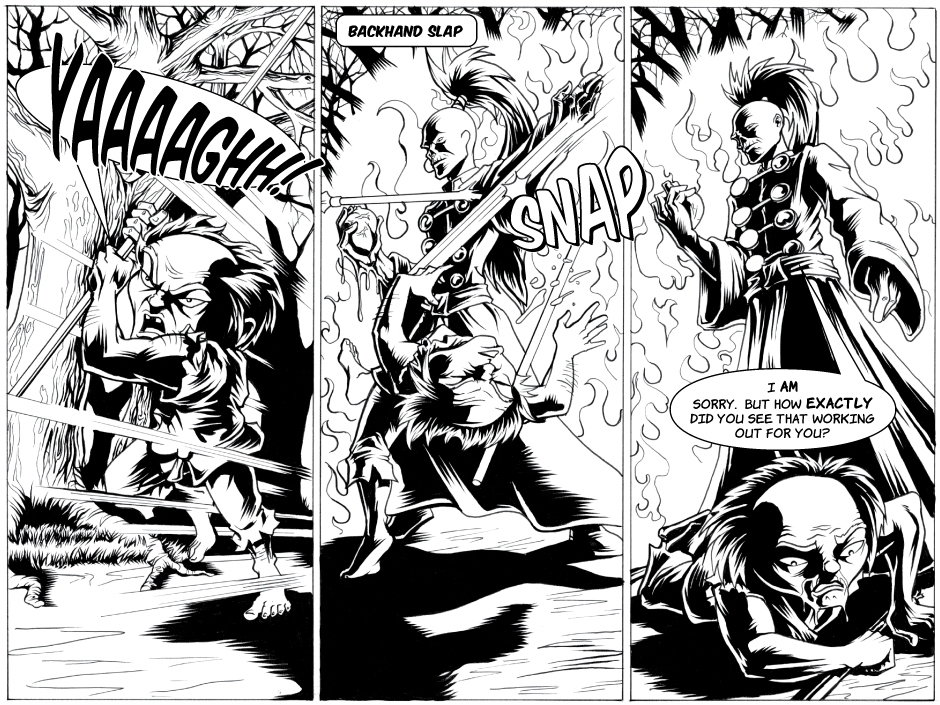 This was a very interesting page for me as it was a last-minute addition. Honestly the comic could have easily flowed from the previous page to the next one. However after the apparent death of his protector, it struck me that how the Old Man responded to it was very important. Had he not done anything I think that would have said something about his character. I had to think, What would the Old Man do in this instance. I realized that while I wanted to portray him as afraid, he was not a coward. Sometimes when out of our element it can take a lot of time and marshaling of our resources and faculties to act. What I loved is that by adding this page it changed subsequent actions later on, making them flow better.