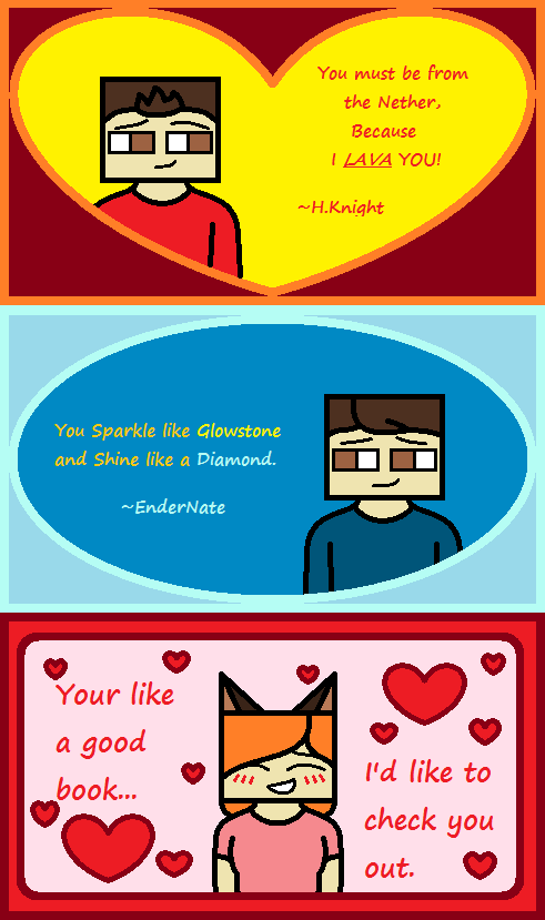 I also had a really bad Valentines day. I tried to tell the guy I liked how I feel about him and he pretty much shot me down. Now I have the song that Meg sings from Hercules stuck in my head. Hunter and Nate came up with the pick up line war. It made me smile. Also shout out to Sir DracoFire for making me feel better too. You all are awesome!!! I couldn't ask for better readers. ^u^ Happy Valentine's Day!