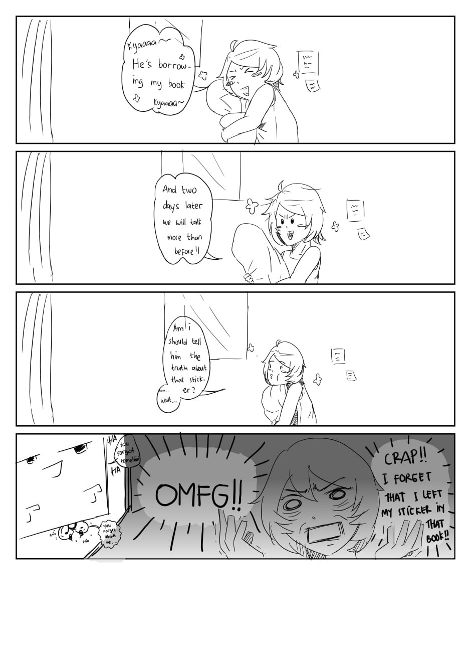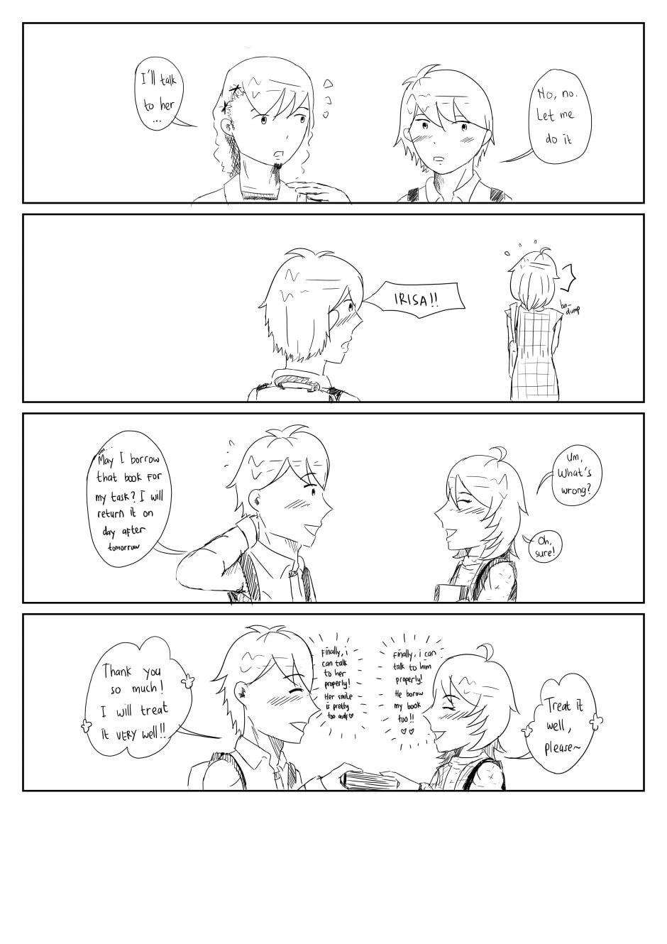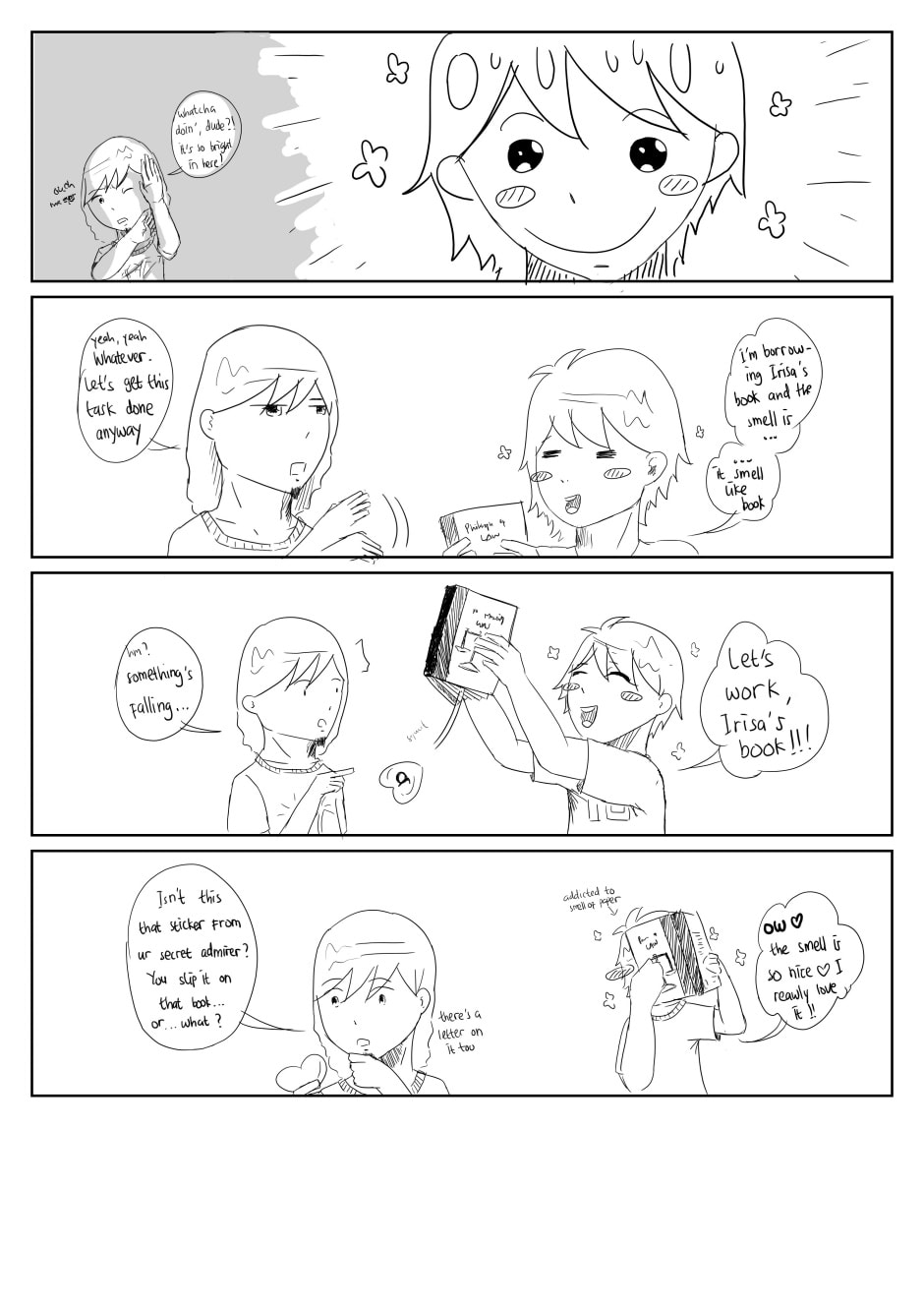 A girl named Irisa like someone in her department. His name is Kuza. As girl, she can't tell her feeling directly to him. So she left a sticker on his motorcycle. And in the next day she left another sticker on his bag, helmet, and on all of his stuff. And it makes Kuza curious. Will he find out who he culprit? Will Irisa tell her truth feeling to Kuza?