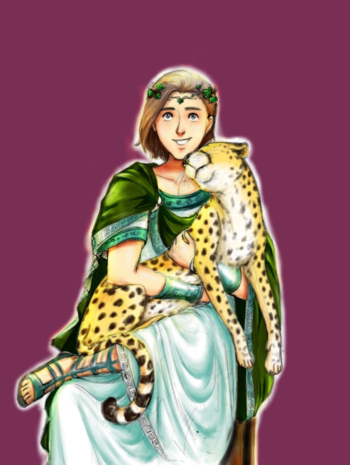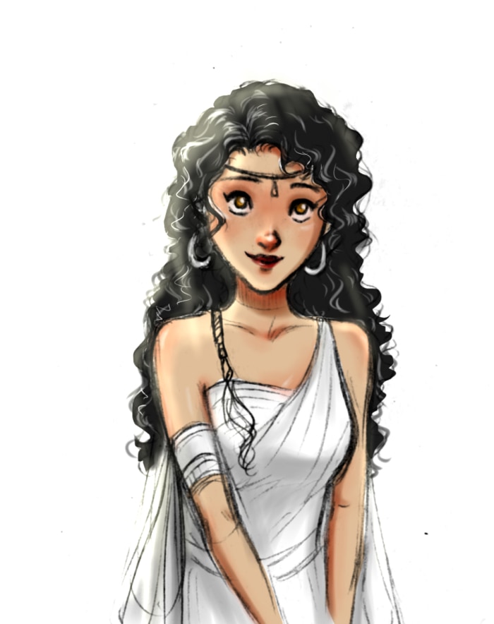 By the way, I also fancy the love story of Dionysus and Ariadne so I draw Ariadne. She is a young lively teenage girl with sun kiss skin and long wavy black hair. I was inspired by Moana when I draw her.
