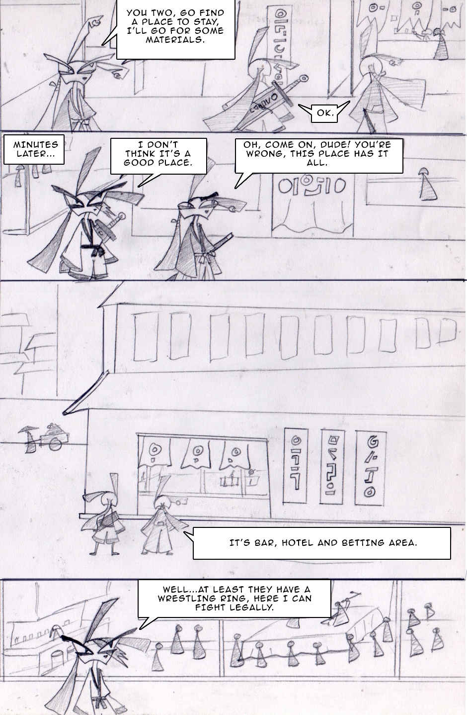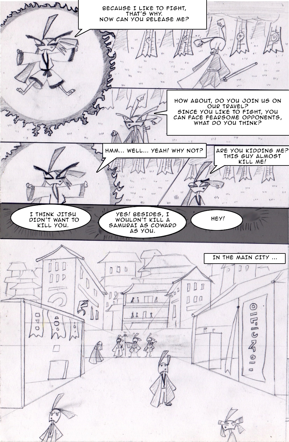 The great warrior miyamoto kyoshiro-doh, begins his travel together with the samurai who wanted to challenge him and lost.