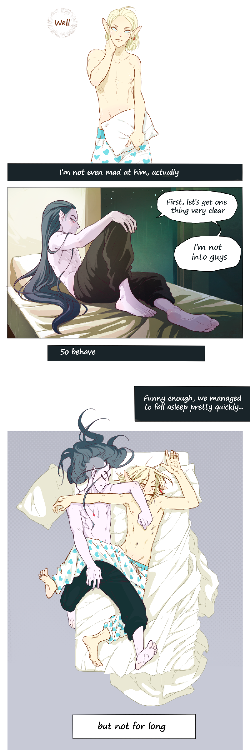 A story about an arranged dynastic engagement of an elf and a vampire, which has no plot and often does not make much sense, so be prepared for this sort of rubbish :) These short and long strips are full of queer and straight love, romance, unicorns and fairytale (lack of) logic in characters’ motivation and the story as a whole.