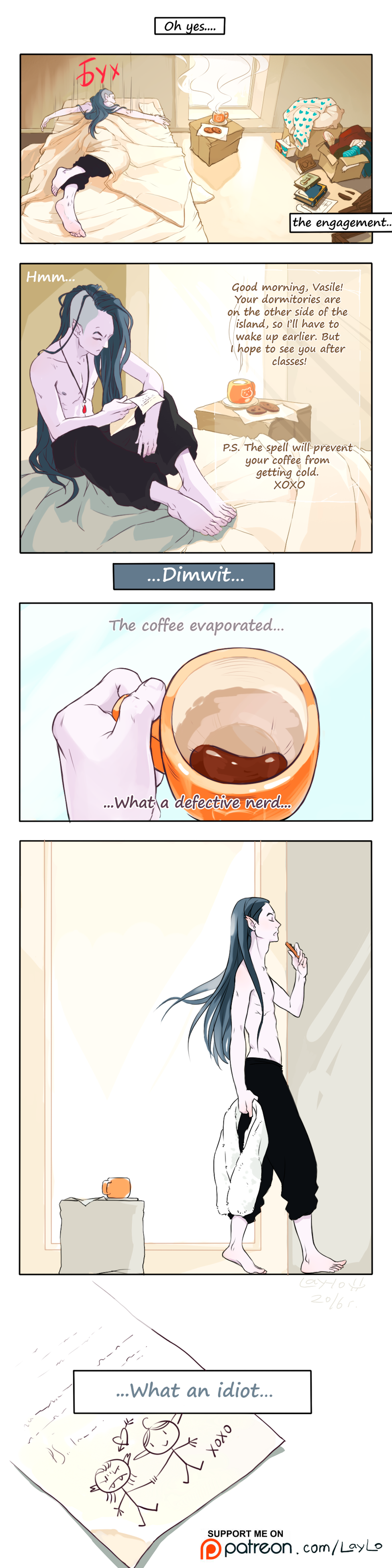 A story about an arranged dynastic engagement of an elf and a vampire, which has no plot and often does not make much sense, so be prepared for this sort of rubbish :) These short and long strips are full of queer and straight love, romance, unicorns and fairytale (lack of) logic in characters’ motivation and the story as a whole.