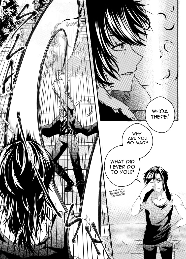 THIS WAS SO DIFFICULT TO DRAW! One of the main reasons why I took a 2 year hiatus was because of these following pages. Action + male characters are my ultimate weakness...! I did my best this time and didn't feel overwhelmed by the page. I hope you guys like it! > <