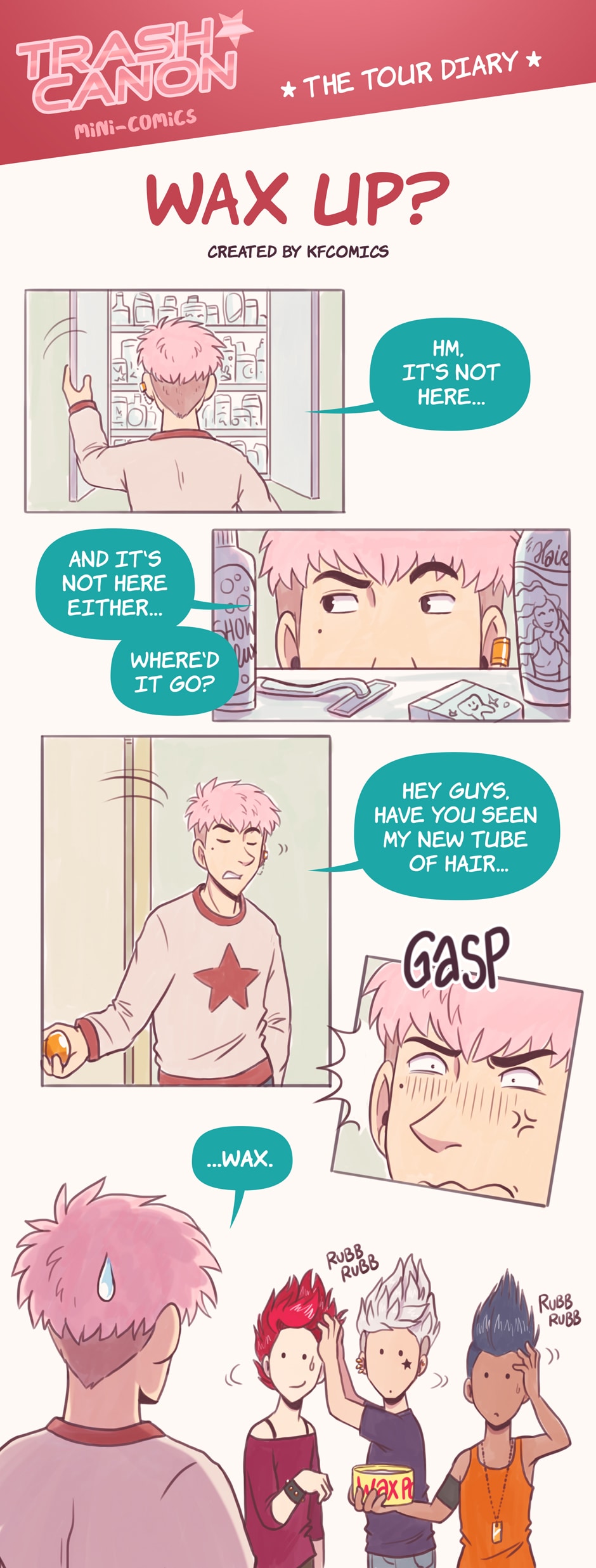 TRASH CANON - The Tour Diary - is a comic series about the four members of the boy group "Trash Canon" – Alek, Levi, Shae and Calyan – and their struggle with everyday life as popstars. Together with their manager Bryan, who has to deal with them 24/7, they have to face numerous challenges – from bad hair styling to severe fashion crimes!