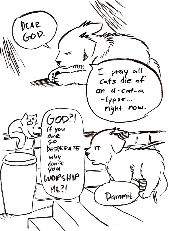 I believe in justice for all. Dogs have benefitted the world with many endeavors that have improved human lives. To list a few: helping blind, old, young, and depressed. Rescue dogs and trained police dogs. Cats? Selfish creatures that bother dogs in their homes, and scratch at each other with strange yowling sounds at night. They do not deserve what we dogs have earned.