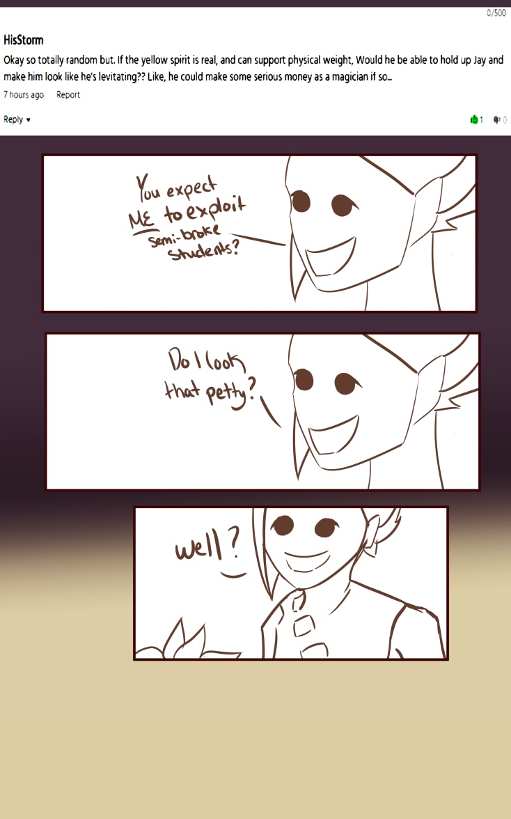 I'll be drawing out all your questions at the end of next chapter or in a tiny update right after it!! from both here and webtoons (but there are no q's here yet so...)