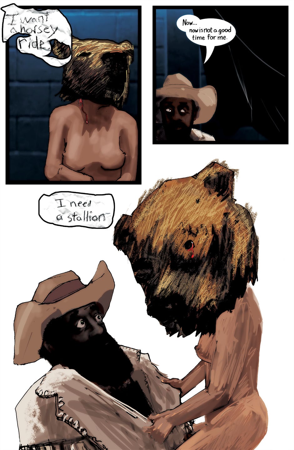 The Secretary is horny and ready to take off her bear-mask, but Holland isn't having it...for fear of what lies underneath, after she took quite a beating...