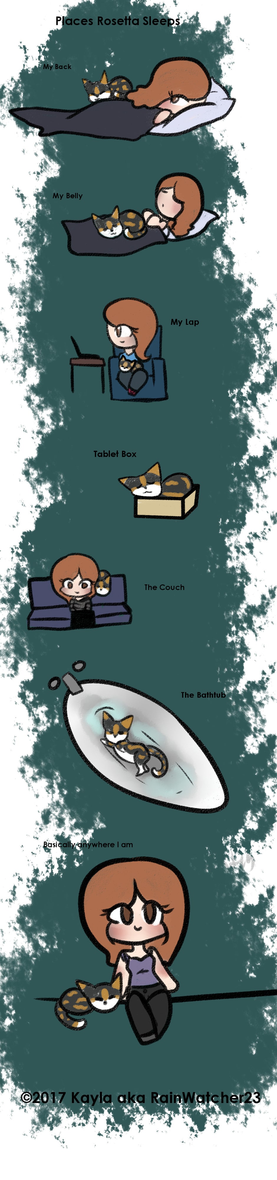 So yeah my cat only seems to sleep when I'm around or near by. These are a few places she has been sleeping since we got her. Check out my Patreon! www.patreon.com/user Want my art on different products? Try my Redbubble! www.redbubble.com/people/kaylag93?asc=u