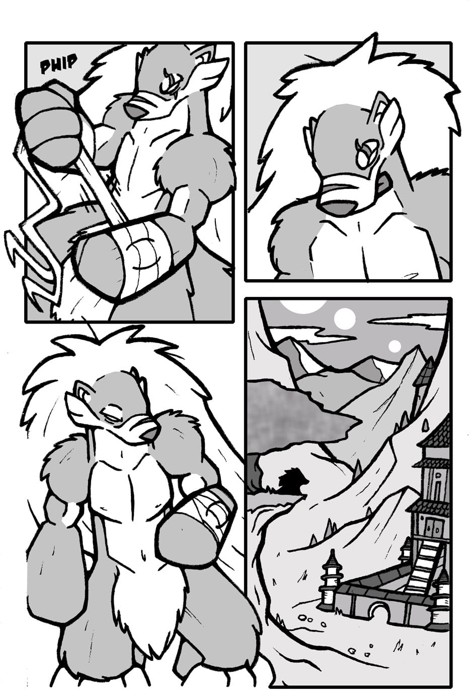 Wolverine guy wraps the cloth from his right hand around the burning eye on his left arm. As he looks at the newly covered eye, he sees an abandoned temple in the distance.