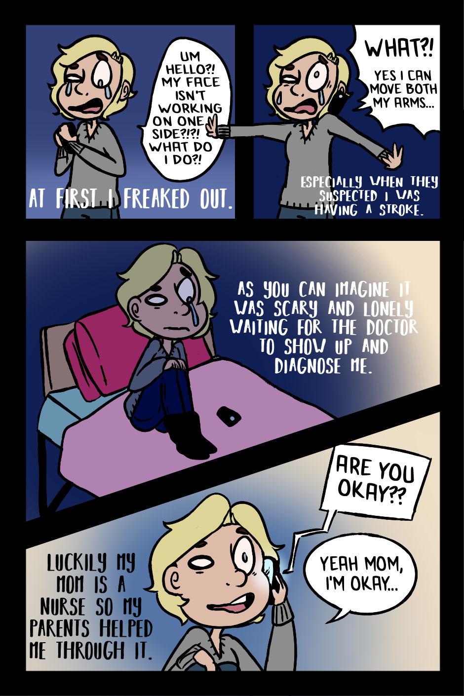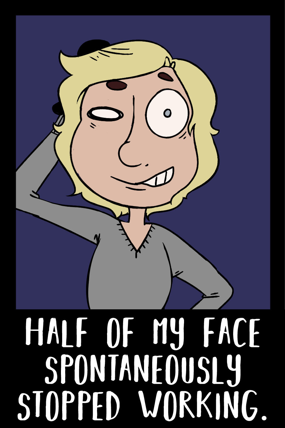 Should be okay in a couple weeks hopefully, but considering how many deadlines I have coming up, it came at a pretty inconvenient time. I'm actually not too bad, some cases have a real droopy mouth and stuff, I look the same unless I grin or try actively to frown. So instead of moping, I've tried to make a cheerful outcome from it, with a wee comic and selfies every day to show how cute I can be with a lopsided face.