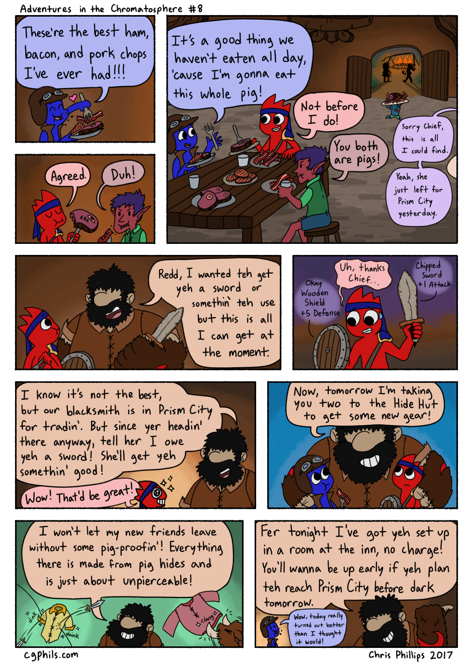 Redd and Indy are showered in hospitality by the Chief of Big Pig Village! Page 8 of Adventures in the Chromatosphere! Updated website link: https://chromatosphere.com/pages/page8