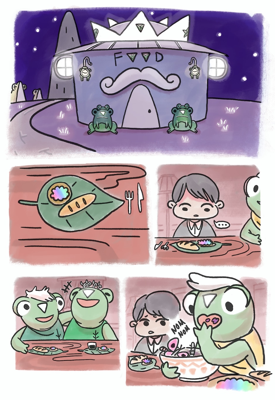 Eating a late night meal with some frogs - a good way to end the day.