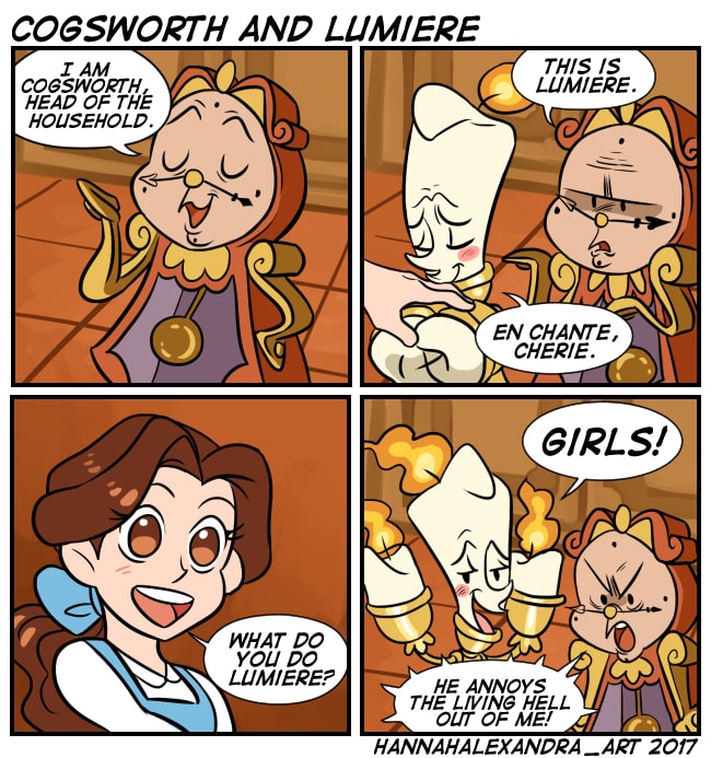 Lumiere just hangs out in the castle for the ladies!!(and cogsworth)